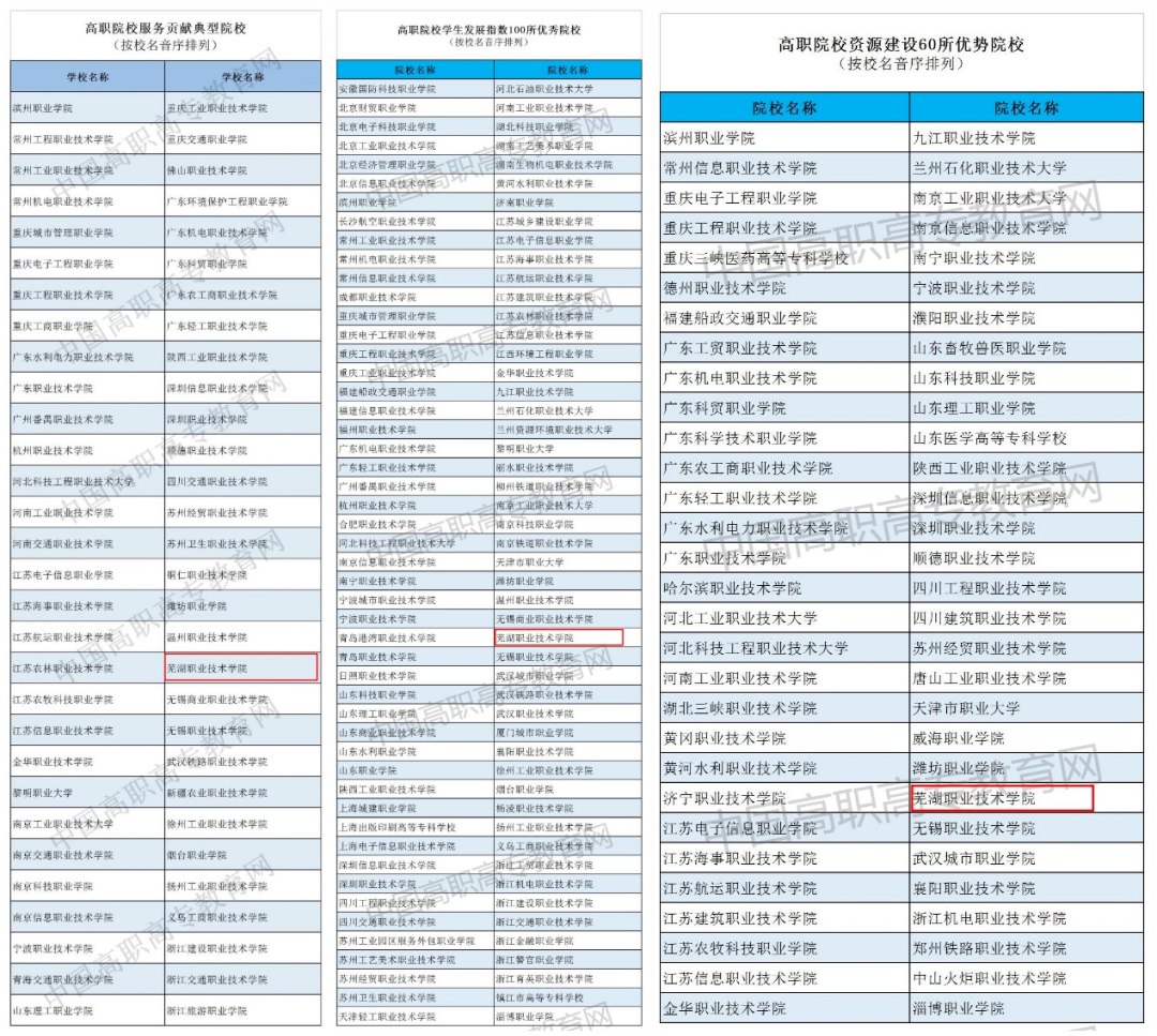 日前,《2022中国职业教育质量年度报告》正式出版,中国高职高专教育网发布高职院校60所服务贡献典型院校、学生发展指数100所优秀院校、资源建设60所优势院校。芜湖职业技术学院成为全省唯一一所入选三个榜单的高职院校。