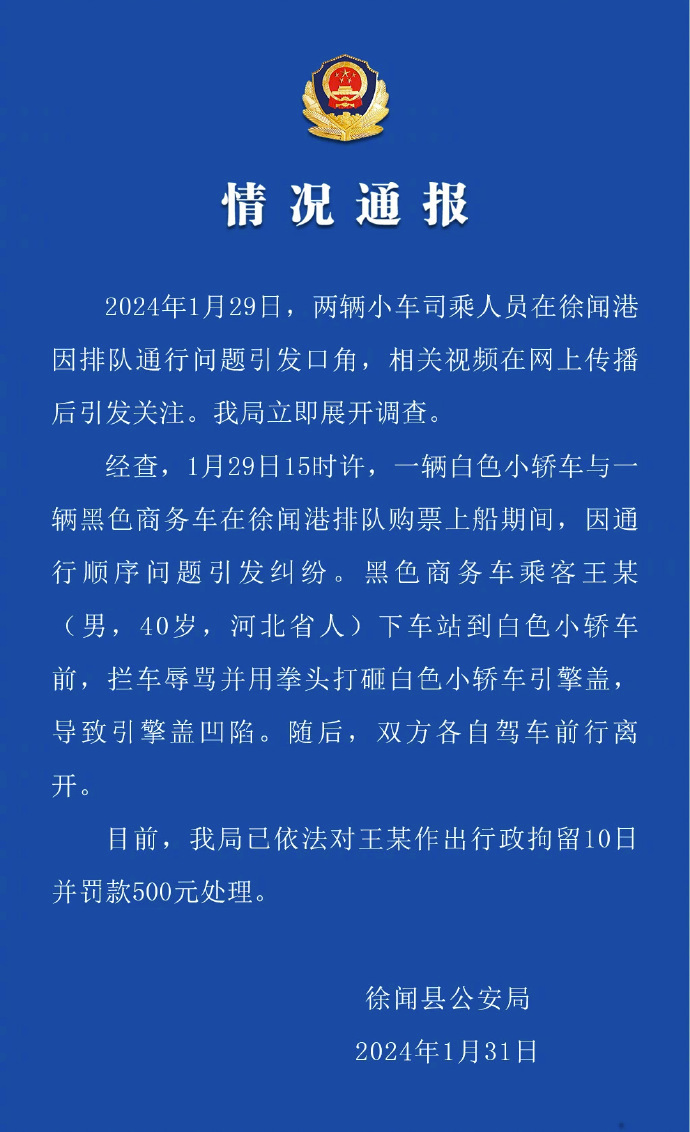 今天下午,广东湛江“平安徐闻”微信公众号就“奔驰车主插队砸车骂人”发布情况通报,徐闻县公安局已依法对奔驰车主王某作出行政拘留10日并罚款500元处理。