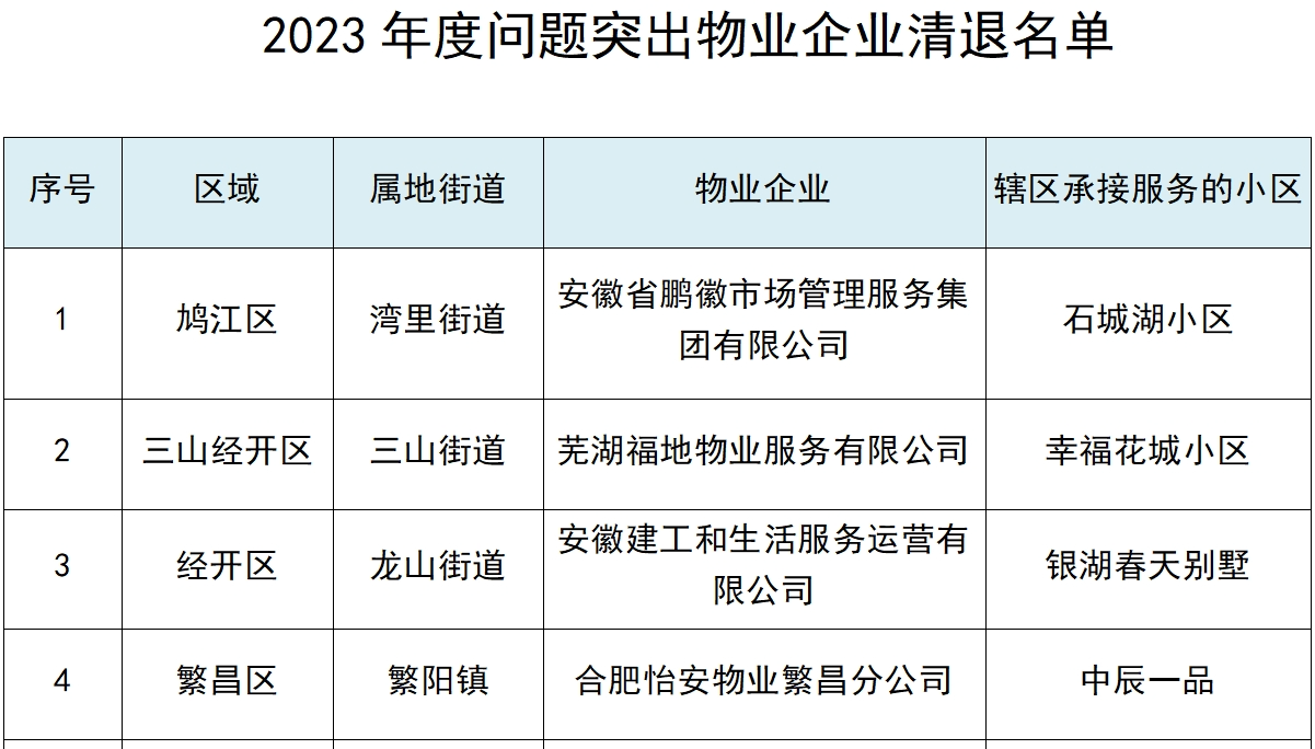 1月29日,芜湖市召开住宅物业管理提升工作推进会,大江资讯记者从会上获悉,2023年,全市物业整治提升工作持续推进,共有11家考核测评靠后且整治不达标的物业服务企业被依法清退。