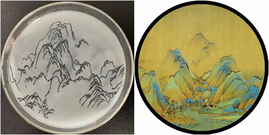 《千里江山图》,左为微生物绘画,右为原画