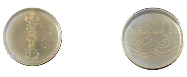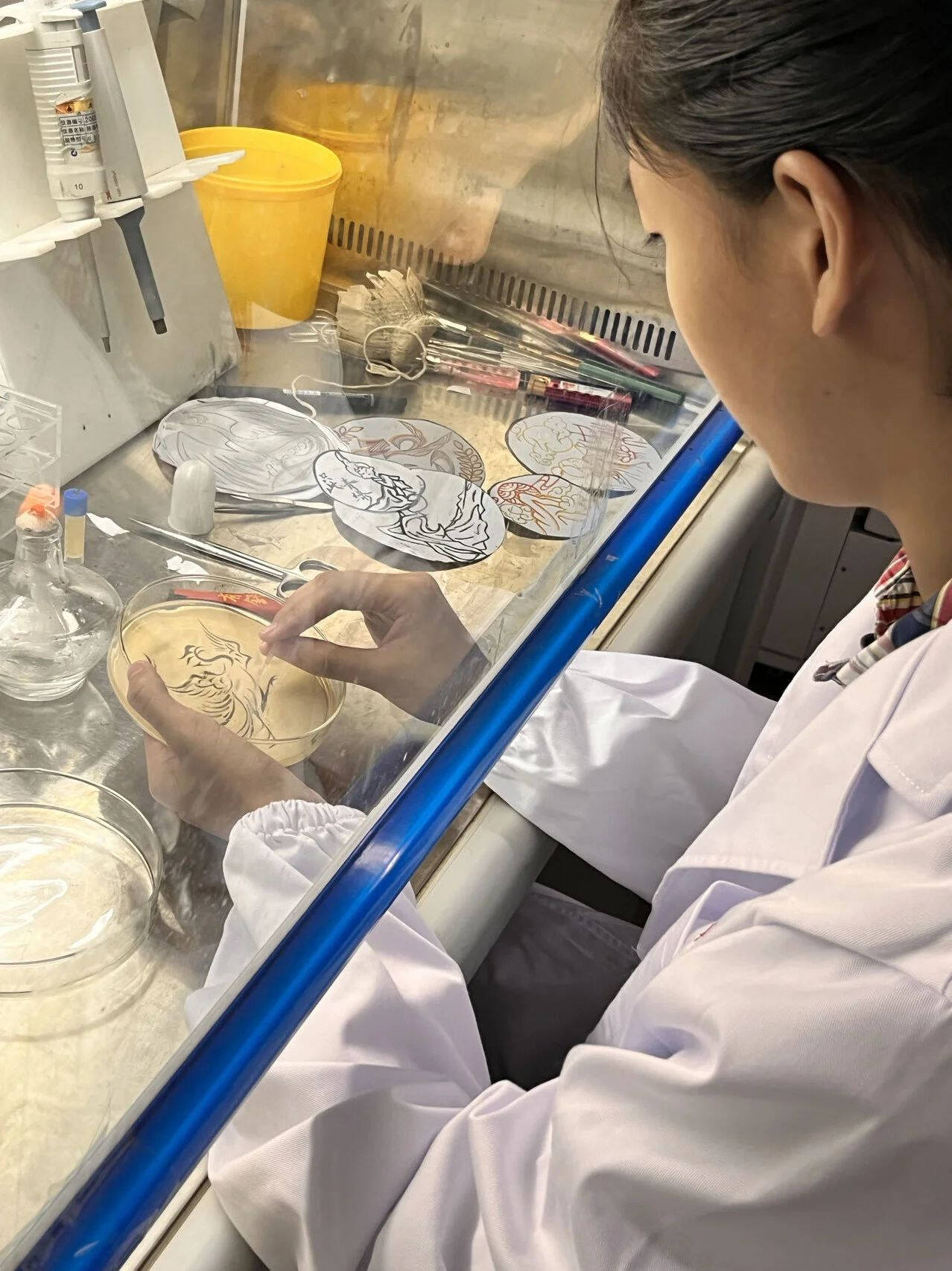 课题组负责人顾涛老师告诉记者,这些颜色斑斓、粗细不一的线条就是各种微生物菌落生长的印迹。培养皿中的各种颜色来自不同菌落天然色彩: