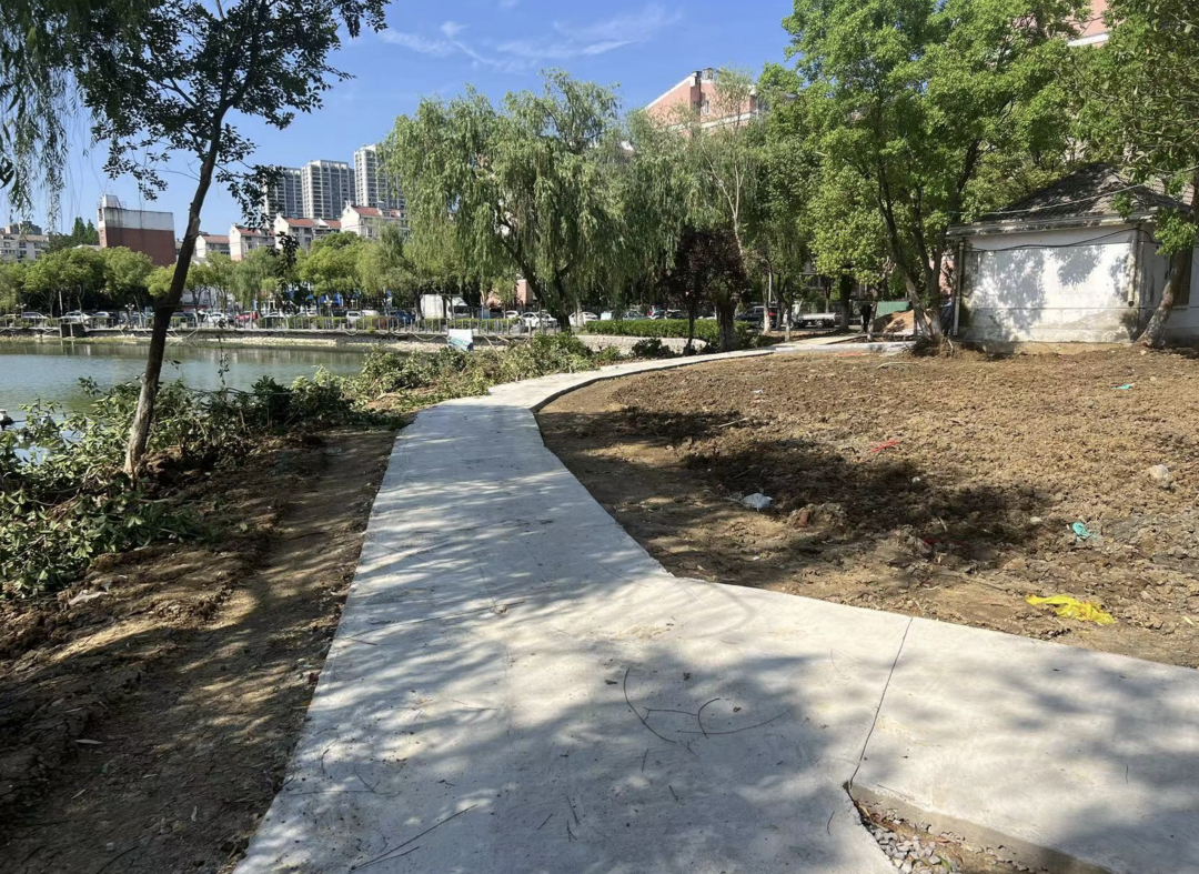 周边环境提升在同步进行中,绿化区域已松土,岸边杂乱的草木丛被清理,即将进行绿化补种;破损的岸坡、花坛将被修复,一条围绕南瑞湖的彩色健身步道也初步建好。预计整个项目6月底完工。