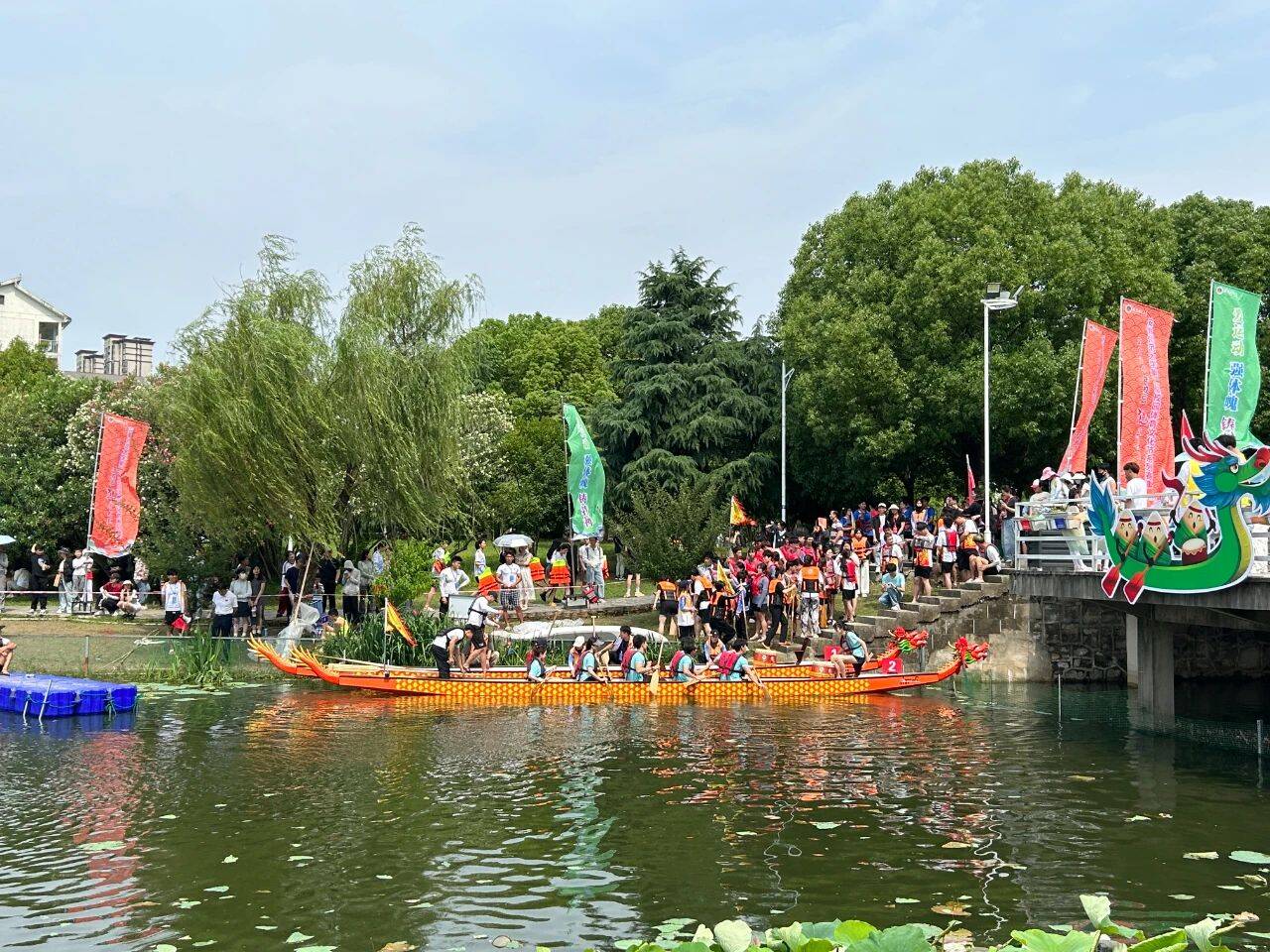 随着一声哨响,龙舟出发,队员们跟着鼓手的节奏飞桨逐浪,划出极为漂亮的水上弧线;岸边围观的观众也不时为龙舟队员们呐喊助威,现场人声鼎沸。