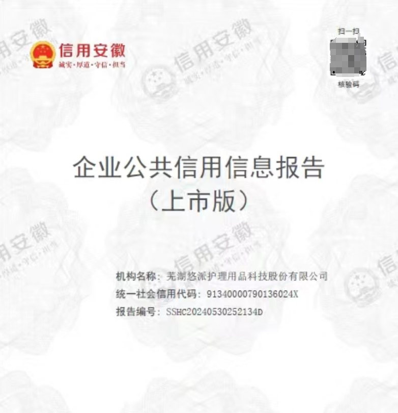 据了解,这份全省首份企业公共信用信息报告(上市版),由芜湖市发改委协调对接,通过省企业上市合法合规信息核查“一件事”联办平台,为芜湖悠派护理用品科技股份有限公司出具。