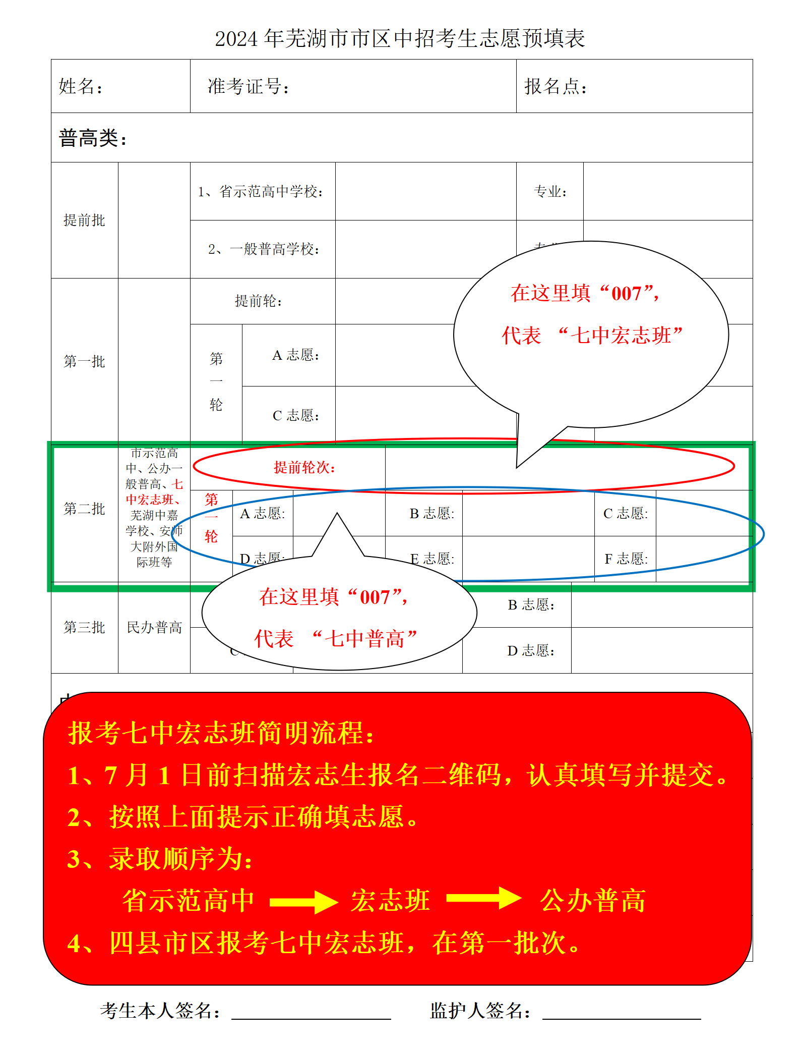 1、报名登记:报名时间为2024年6月 18日—7月1日;考生可在芜湖市智慧教育平台“芜湖七中公示公告” 栏目(网址http://wh7z.whzhjy.cn/)或关注芜湖市第七中学公众号,扫描宏志班招生二维码,也可扫描《2024年芜湖市第七中学宏志班招生宣传册》上的二维码,填写报名表后提交。(报名登记后,还必须正确填报中招志愿,否则不能录取) 2、志愿填报:芜湖七中宏志班市区志愿在第二批提前轮次中填报,四县市区志愿与当地省示范高中同批次填报。一经录取,即成为七中宏志班学生,后面批次报考的学校均不再录取;若未录取到七中宏志班,不影响后面批次报考学校的录取。