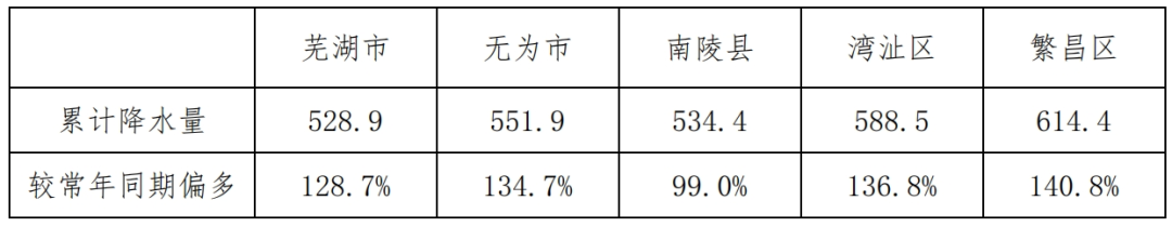 表 1:6 月 19 日-7 月 14 日芜湖市累计降水量及常年同期对比(单位:毫米)