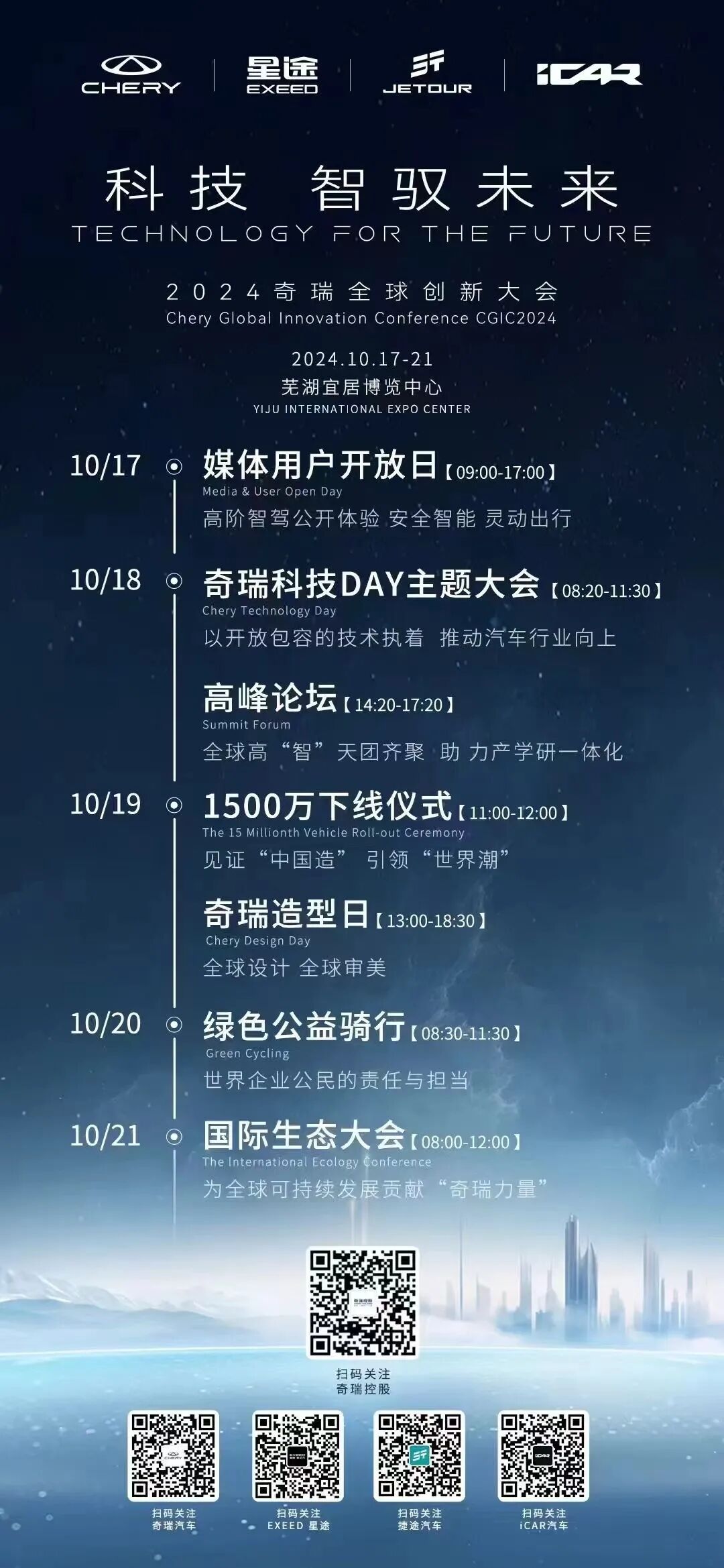 高朋满座,嘉宾云集!奇瑞全球创新大会来了 字体大小: T T 2024-10-17 21:56 徐志与奇瑞“全球创新大会”重要嘉宾举行工作会谈10月17日晚,受市委书记宁波委托,市委副书记、市长徐志与中国科学院院士、清华大学学术委员会副主任欧阳明高等近20位参加2024奇瑞“全球创新大会”的重要嘉宾举行工作会谈。市委副书记、政法委书记张东,市领导韦秀芳、朱的娥参加。徐志对各位院士专家、企业家来芜表示欢迎。他说,芜湖坚持创新驱动发展,牢固树立抓创新就是抓发展、谋创新就是谋未来理念,培育出以奇瑞为代表的一大批优秀创新型企业,拥有省级以上研发机构70个,位列国家创新型城市第26位。下一步将继续把创新摆在最重要位置,进一步完善创新体系建设,充分发挥市场在资源配置中的决定性作用,坚定不移支持奇瑞走创新发展之路,恳请各位专家学者、企业家继续关心芜湖、支持奇瑞。欧阳明高表示,作为与奇瑞有着深厚渊源的“老朋友”,自己一路见证了奇瑞20多年来的发展历程,由衷地为奇瑞近几年快速发展感到骄傲,衷心祝愿奇瑞在国际化发展道路上能够走得更快更稳。奇瑞将于10月17日至19日在宜居国际博览中心举办以“科技智驭未来”为主题的全球创新大会,通过2024科技 DAY、院士高峰论坛、1500万辆下线仪式等系列活动,集中展示奇瑞及行业内最新科研成果、创新产品与技术解决方案。▍记 者:赵丹丹 周文瀚▍编 辑:叶 荔