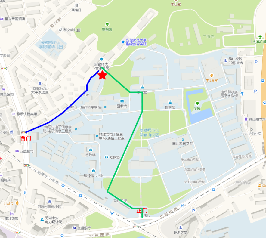 西门距离乐理和听写考试地点最近,北门最远,请考生根据自身情况做好交通安排,示意图: