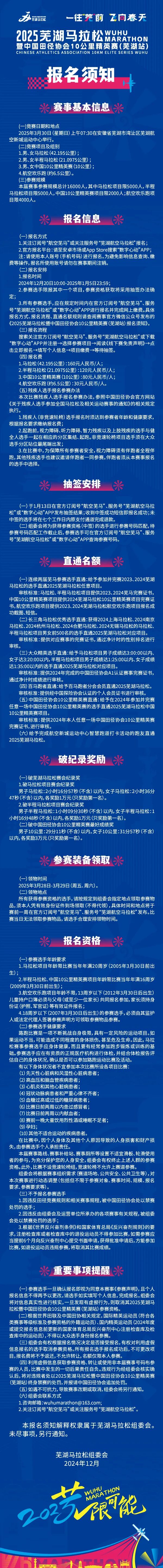 本次比赛于2025年3月30日(星期日)上午07:30在安徽省芜湖市湾沚区芜湖航空新城运动中心鸣枪起跑。