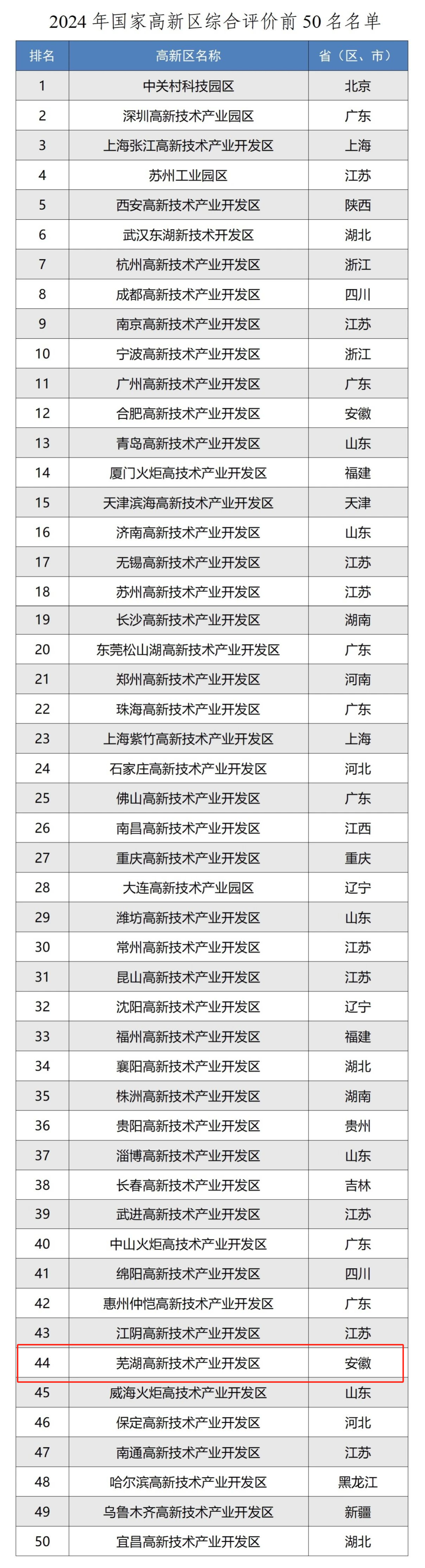 芜湖高新区,全国50强! 字体大小: T T 2024-12-24 17:31 近日,工业和信息化部公布2024年178家国家高新区综合评价结果。在综合评价前50名榜单中,安徽两家高新区上榜,其中,芜湖高新技术产业开发区位列第44位。芜湖高新技术产业开发区位于芜湖市中心区域,是安徽省第二家国家级高新技术产业开发区。作为芜湖新能源汽车重大新兴产业基地核心承载区,芜湖高新区近年来大力发展智能网联及新能源汽车产业,以奇瑞新能源、奇瑞商用车为核心,引育“三大电”、“六小电”、智能网联技术、新材料、车规级芯片等产业链上下游关键企业200家,初步形成“整车-零部件-后市场”三位一体全面发展格局。据悉,我国从1988年启动了第一个国家高新区建设,到目前为止达到178家,国家高新区已成为我国实施创新驱动发展战略的重要载体。今年,工业和信息化部修订的《国家高新技术产业开发区综合评价指标体系》明确,国家高新区综合评价涉及高质量发展综合质效、科技创新与成果转化,产业结构与竞争力、智能化绿色化发展、开放合作与国际化水平、营商环境与创新创业创造活力等一级指标。▍记者:骆新星▍编辑:叶 荔