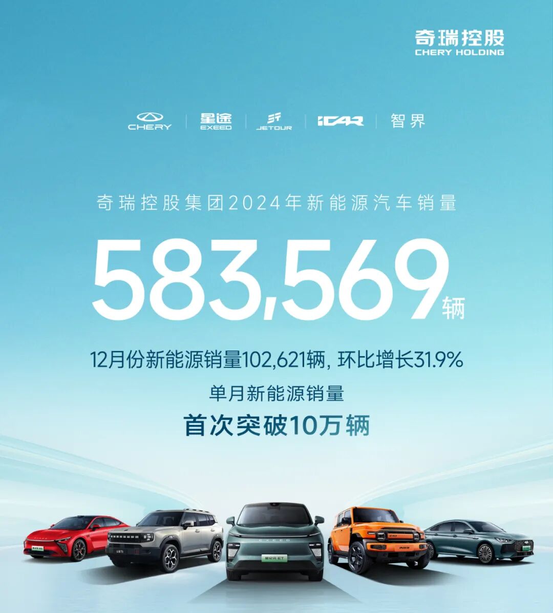 奇瑞控股集团2024年销售汽车2,603,916辆,同比增长38.4%,创造了年销量的历史新高。年度新能源销量583,569辆,同比增长232.7%,增速位居主流车企首位。其中,12月份新能源销量102,621辆,环比增长31.9%,单月新能源销量首次突破10万辆。伴随着奇瑞新能源战略持续升级,集团新能源销量节节攀升,不断刷新新能源销量纪录。自2024年3月份以来实现新能源销量“十连涨”,接连迈过5万辆、7万辆、10万辆门槛,挺进行业前列,兑现了新能源“不客气”的承诺。奇瑞新能源销量的快速增长,得益于“技术奇瑞”的强势赋能。奇瑞集团坚持“油电协同、优势融合”的产品策略,采取多品牌差异化布局、“混动、增程、纯电、氢能”并举的多技术路线。在混动赛道上,奇瑞依托28年深耕发动机的技术积淀成就了混动赛道的竞争优势。奇瑞自研的鲲鹏超能混动C-DM系统,拥有全域高性能、持续高节能、控制高智能、电池高安全等核心优势,获得了“中国心”2023年度十佳发动机及混动系统称号。在纯电赛道上,去年10月份鲲鹏动力新成员“鲲鹏电池”品牌正式发布,标志着奇瑞补齐了在新能源的最后一块拼图,助力奇瑞构建更完整、更强大的新能源技术体系。奇瑞还重磅宣布鲲鹏固态电池的研发也已经在行动,规划2027年批量上市,引领电池动力新高度。在增程赛道上,奇瑞发布的“黄金增程”动力系统,以高达44.5%的热效率与优秀的噪音和振动控制(NVH)水平获得“中国心”2024年度十佳新能源汽车动力系统奖,树立行业增程技术新标杆。