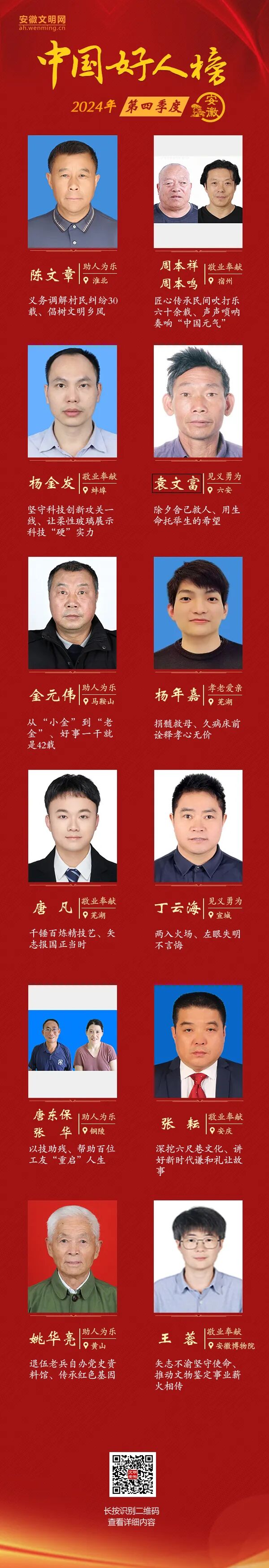 1月15日,中央精神文明建设办公室发布2024年第四季度“中国好人榜”,安徽14人荣登榜单,其中芜湖的杨年嘉、唐凡名列其中。