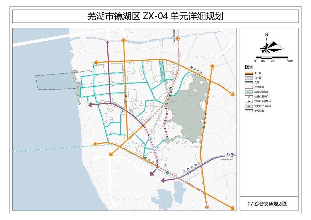 另根据单元详细规划,该区域将构建级配合理、功能完善的城市道路系统,包括快速路、主干路、次干路和支路四个层级,规划形成“两横三纵”主干路网体系,并规划7处社会停车场。 从规划图可以看到,轨道交通2号线延伸线将通过区域内黄山西路向西延伸,直至过江。