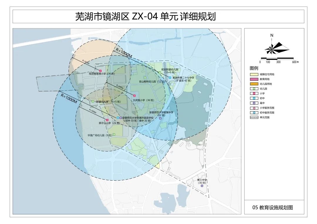 该单元定位为城市综合服务中心、优质研创教育资源集聚地。从现有教育资源看,规划范围内有一所省示范高中安徽师范大学附属中学,以及芜湖市第二十七中学、第十一中学。另外还有两所小学分别是狮子山小学和大庆路小学。