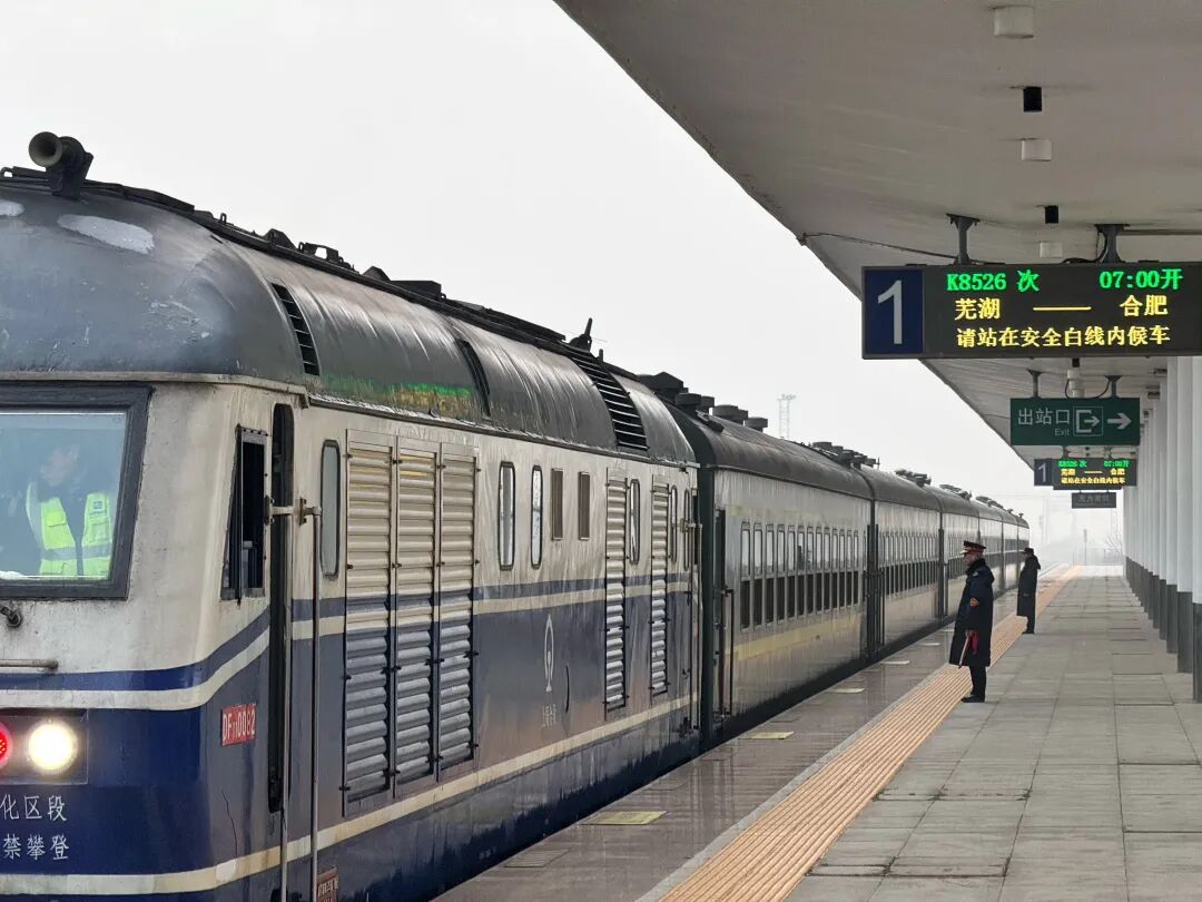 从芜湖出发,这趟绿皮车一路经停无为南、龙桥、庐江、舒城,最终抵达合肥站。行程结束后,它将升级为更加舒适的新空调车,继续服务沿线居民,承载无数人对美好生活的向往驶向远方。