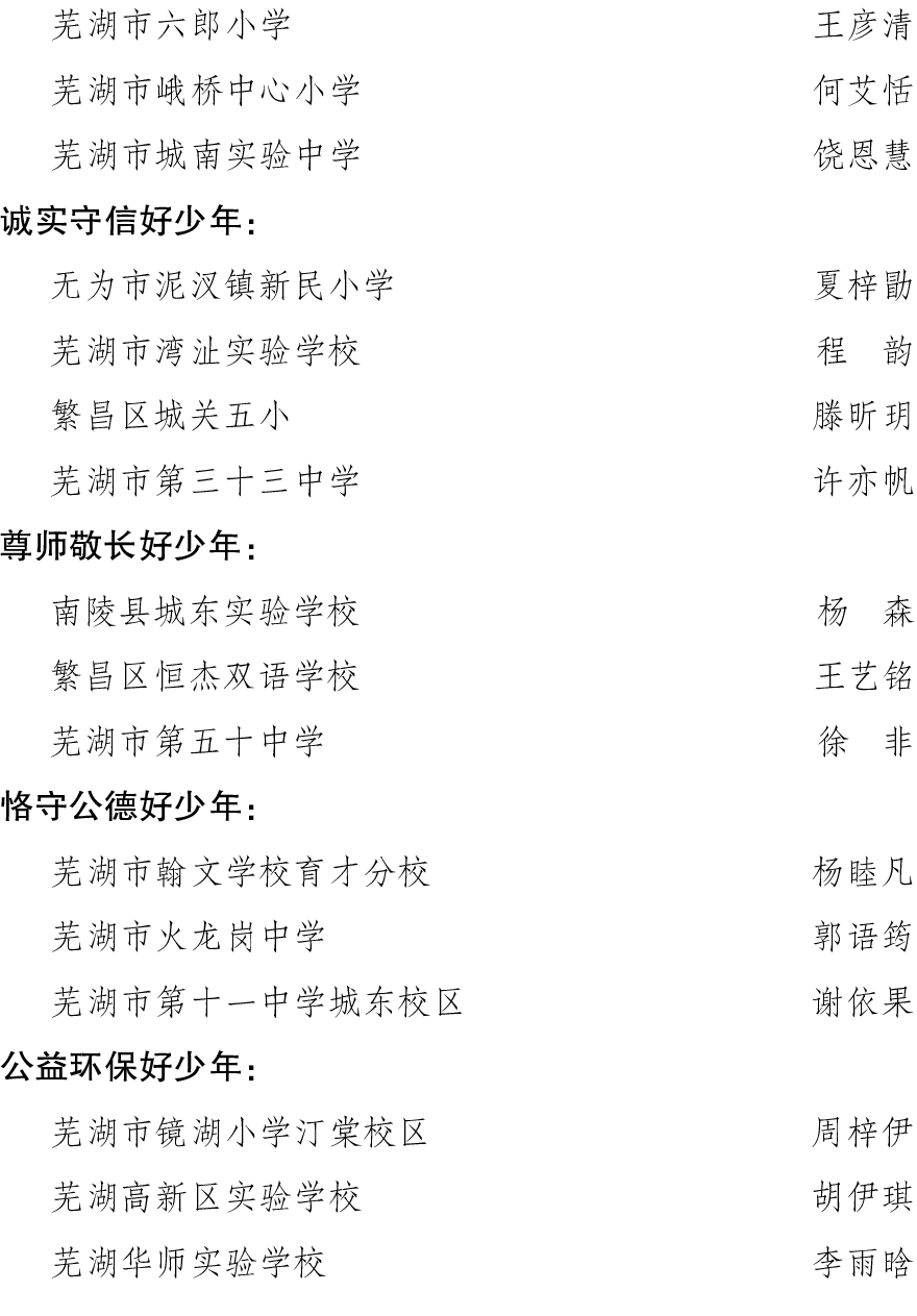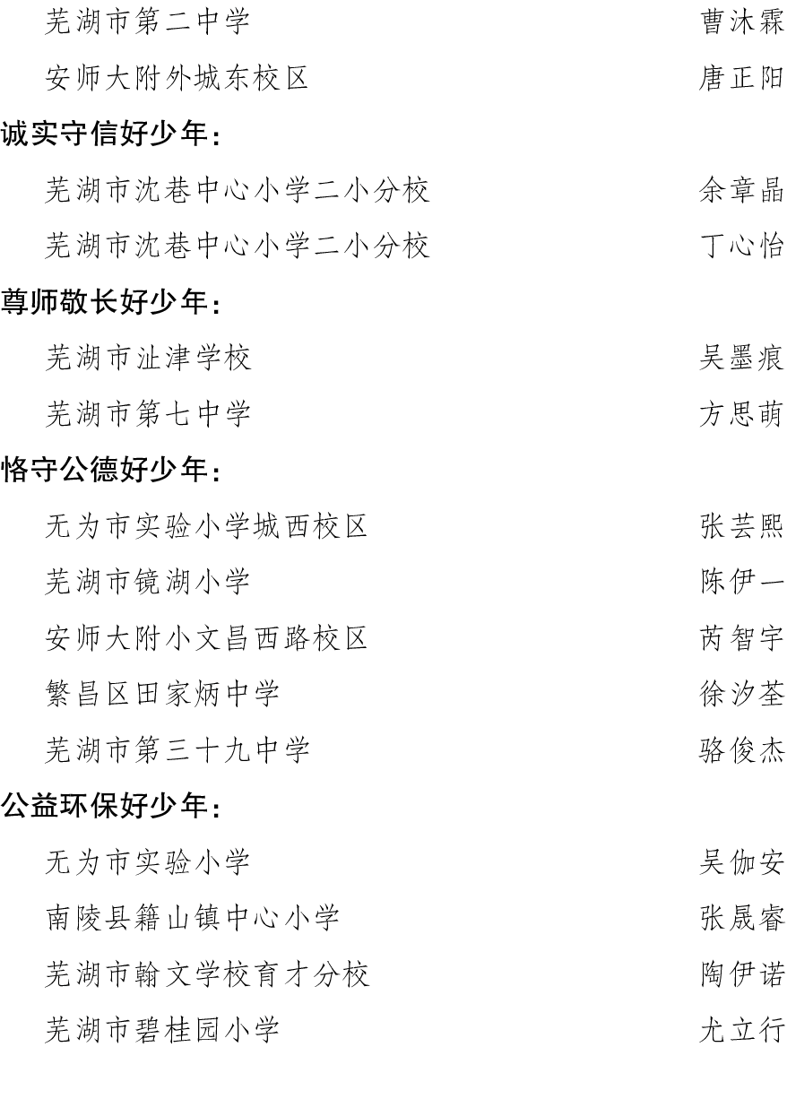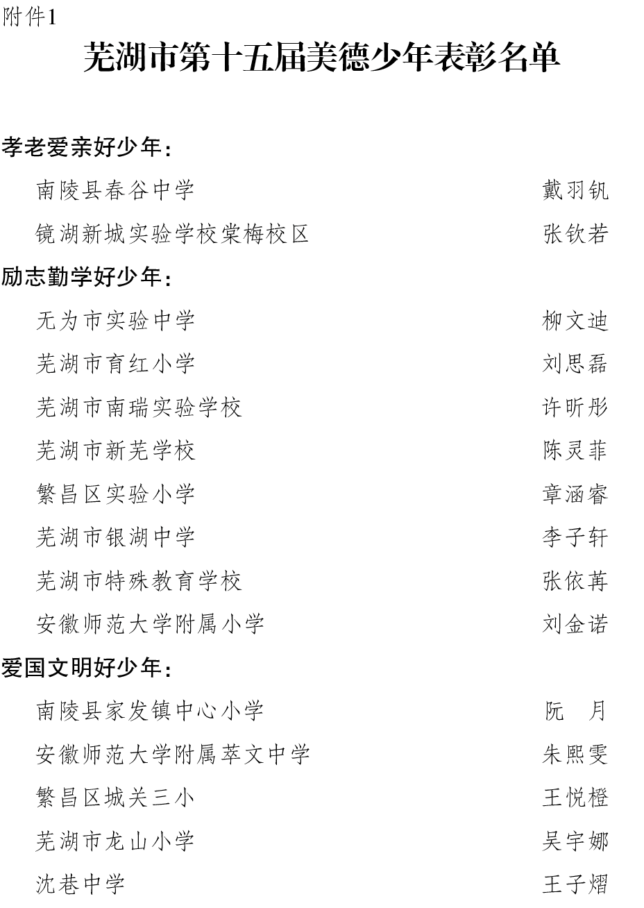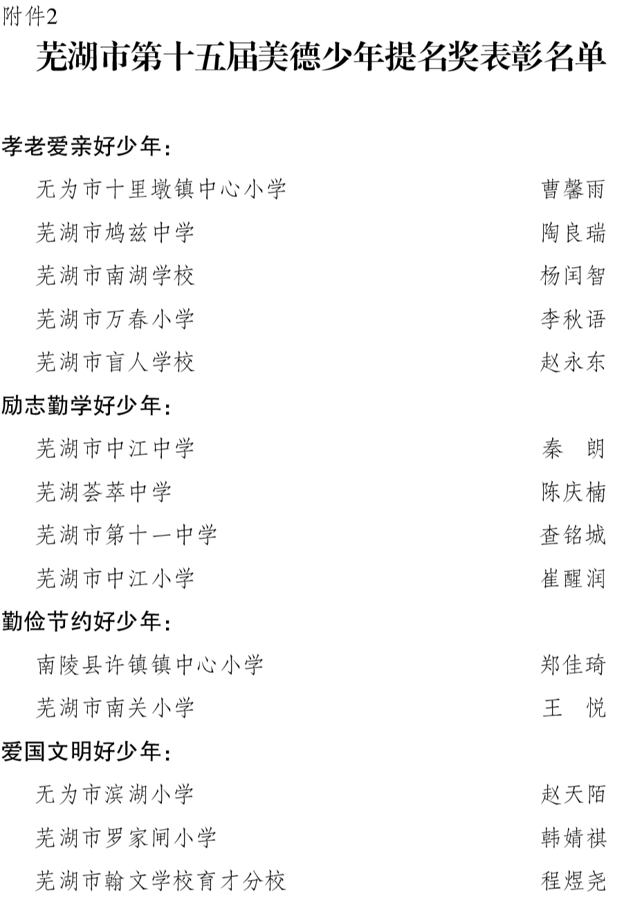 2.芜湖市第十五届“美德少年提名奖”表彰名单