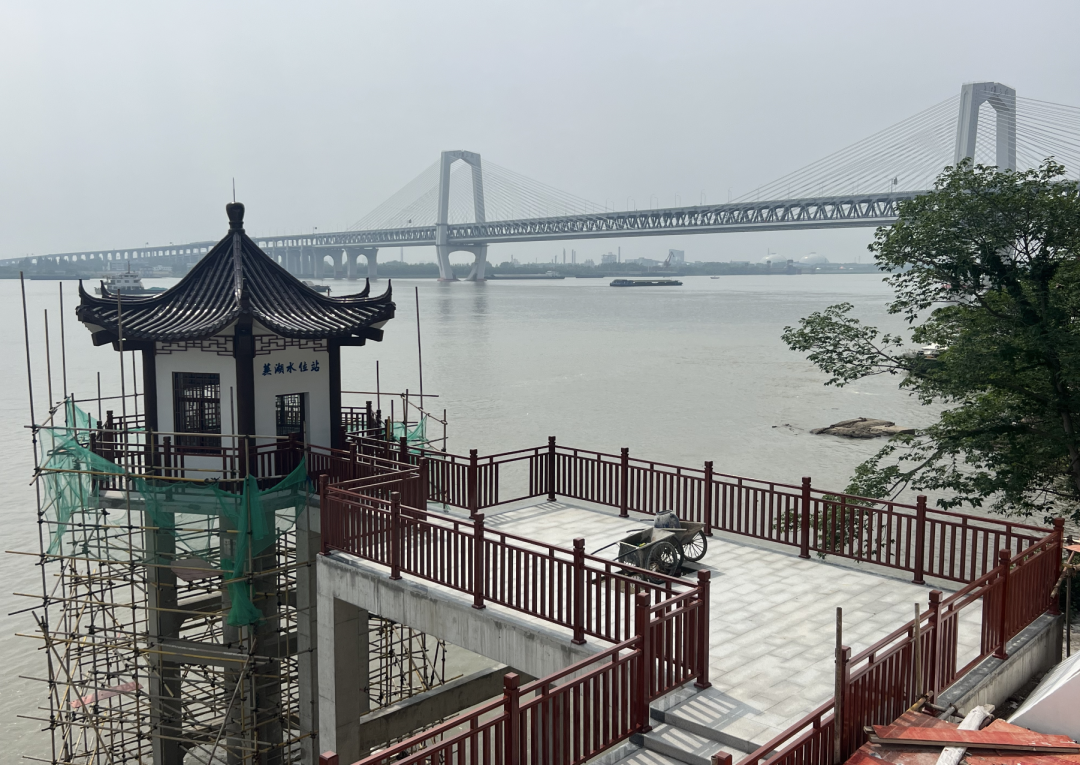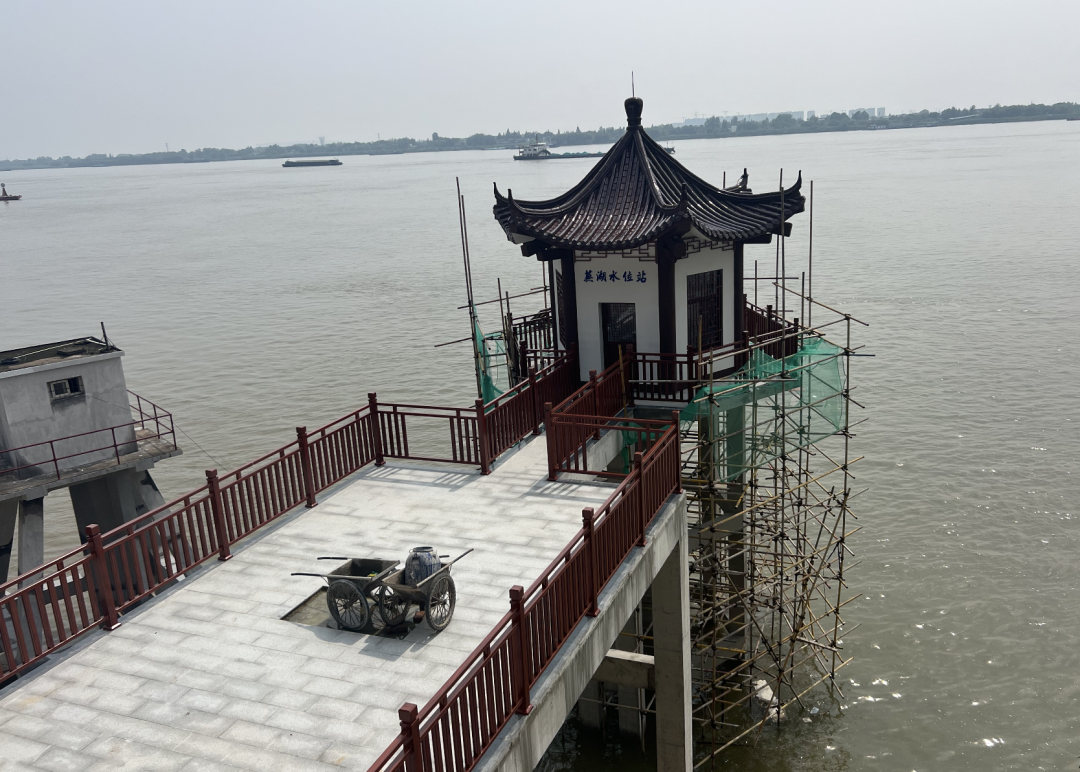 此次芜湖水位站改造升级重点是亭子(自记井房)的顶部琉璃瓦翻新,外墙出新及护栏更换。此外,新建了80多米的江边栈桥连接芜湖水位站,另一头连通芜湖造船厂旁的长江防洪墙。