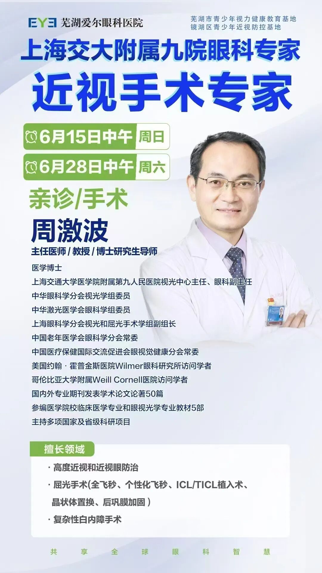 6月15日下午1点,国家级眼科专家——上海交大附属九院近视手术专家周激波教授来芜,坐诊芜湖爱尔眼科医院。诊疗名额有限,有需要的市民务必尽早预约,拨打芜湖爱尔眼科医院电话0553-6960000,或通过芜湖爱尔眼科医院微信公众号均可。
