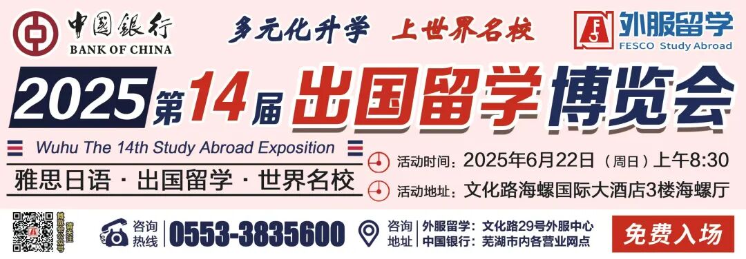 在人才竞争日益激烈的当下,如何把握多元化升学机遇冲刺世界名校?如何规避风险,实现留学价值最大化?6月22日(周日)上午,2025芜湖第十四届出国留学博览会将在文化路海螺国际大酒店开幕。这场由芜湖国际商会主办,国家外汇管理局芜湖市分局指导,中国银行芜湖分行和外服留学芜湖中心共同承办的皖江地区规模最大、影响力最广的国际教育盛会,将汇聚全球优质教育资源,为芜湖及周边学子铺设通往世界舞台的“绿色通道”。