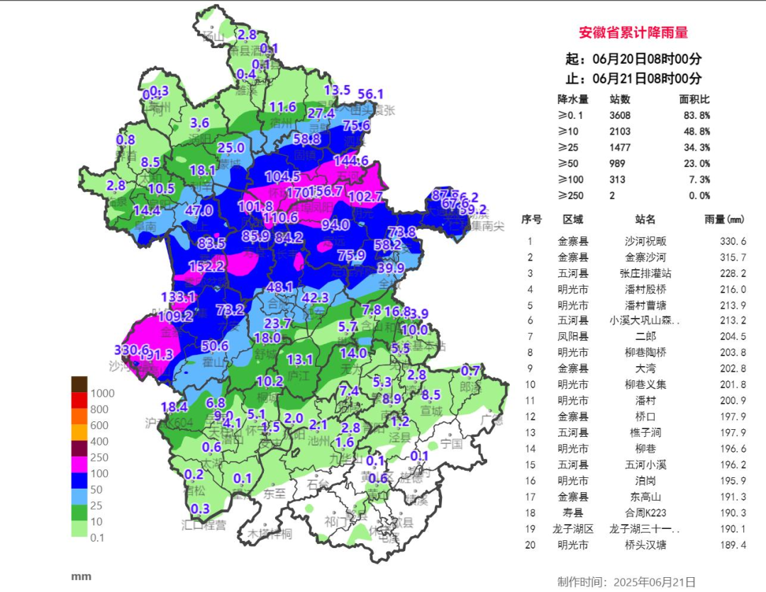 6月20日8时至6月21日8时,强雨带位于我省沿淮地区,蚌埠、淮南、六安等地出现大暴雨,最大雨量测站六安市金寨县沙河祝畈站330.6毫米。