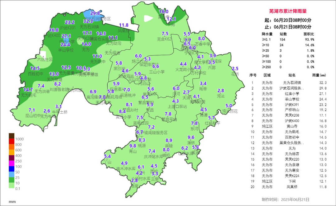 6月20日8时至6月21日8时,我市累计降水量市区5.5毫米,无为市14.0毫米,南陵县8.9毫米,湾沚区2.8毫米,繁昌区5.3毫米,最大雨量测站无为市石涧镇站32.3毫米。