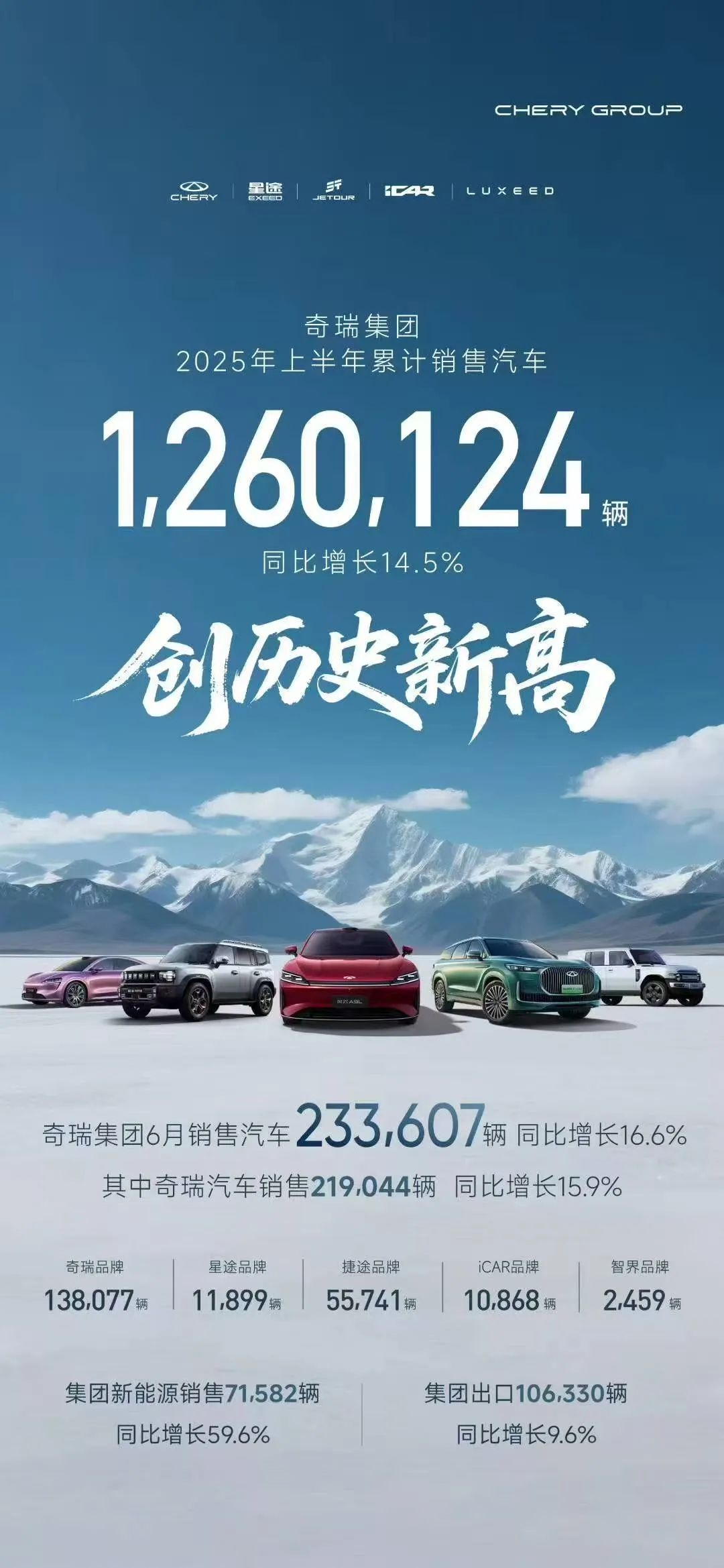 1-6月份,奇瑞集团实现“销量、出口、新能源、技术”四大历史性突破,交出了一份高质量发展的精彩答卷: