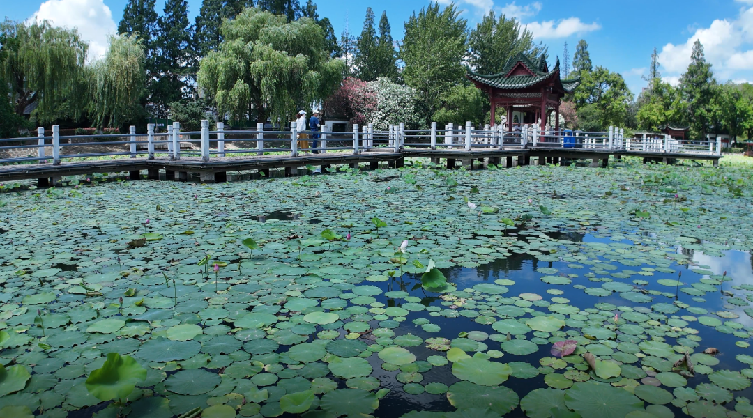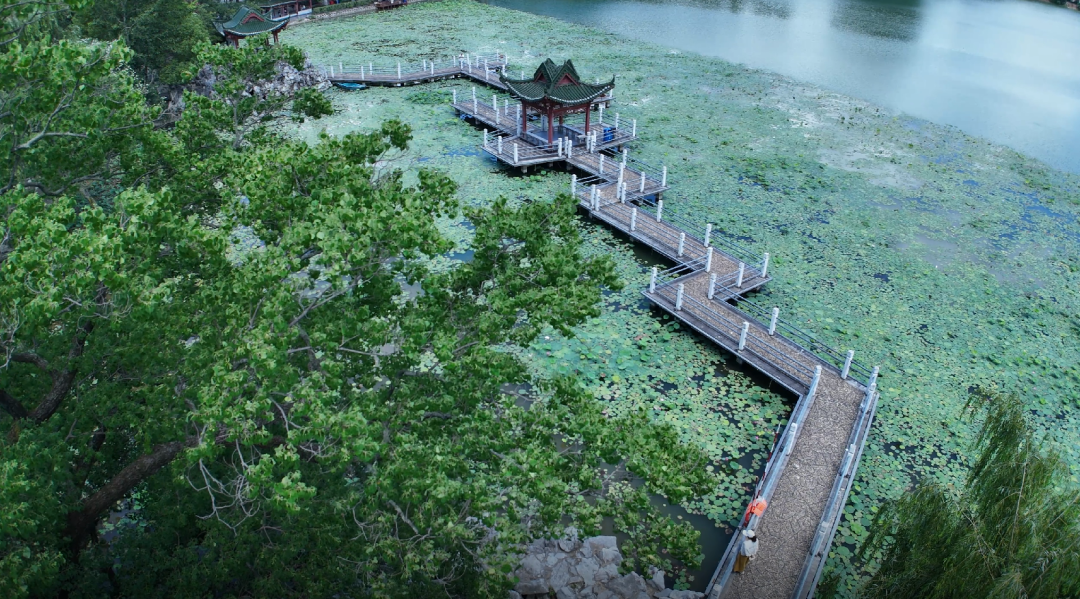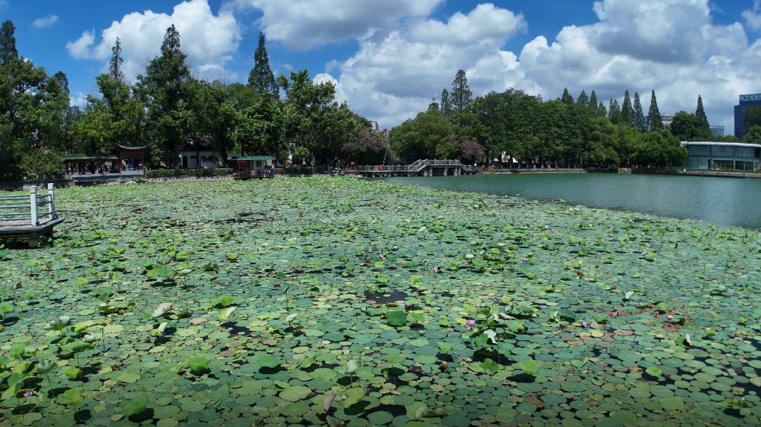 荷花位于小镜湖九曲桥周边,密密的荷叶上已陆续绽放了不少花朵,粉红的花点缀着绿色的叶,有的高、有的矮,有的半含苞,有的全然盛开。虽才栽种一个月,但陆续绽放的荷花还是给游客带来不少惊艳的感觉。湖边有亭、廊相连,不少人在廊亭里闲坐着,顺便赏看荷花及远处风景,一幅悠然自得的画卷!荷影摇曳,荷香缥缈,浸润了这座近千年历史的公园。