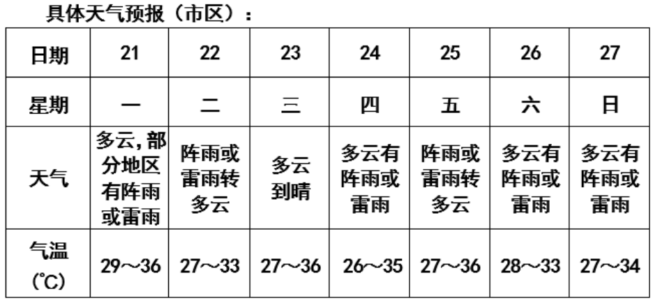 21-22日、24-27日分别受第6号台风“韦帕”和热带低压系统外围影响有阵性降水过程,最高气温35~36℃。