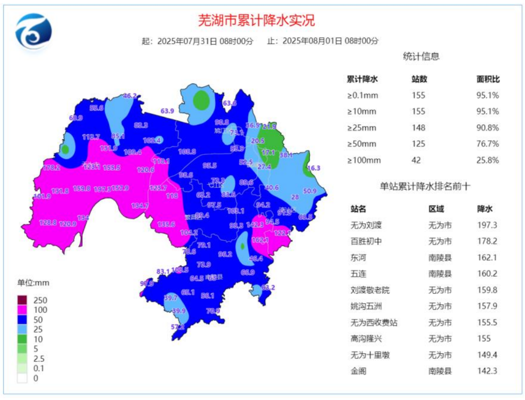7月31日08时至8月1日08时全市雨情:市区34.8毫米、无为市85.1毫米、南陵县78.5毫米、湾沚区28.0毫米、繁昌区89.4毫米。全市共有125个测站累计降雨量超过50毫米,其中42个测站累计降雨量超过100毫米,最大测站无为刘渡站197.3毫米,最大小时雨强南陵县五连站46.0毫米(7月31日15-16时)。