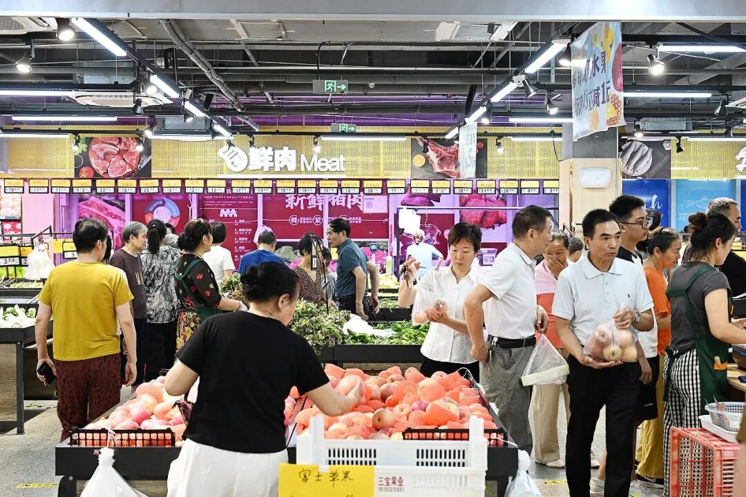 同时,一楼的生鲜菜市场已热闹起来,小张穿过人群,径直走向蔬菜区,吹着中央空调的凉风,码放整齐的蔬果看着新鲜水润。