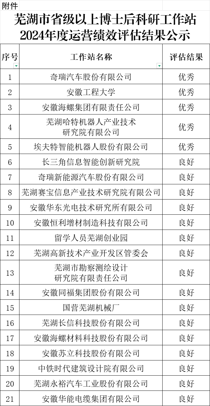 芜湖市省级以上博士后科研工作站2024年度运营绩效评估结果公示
