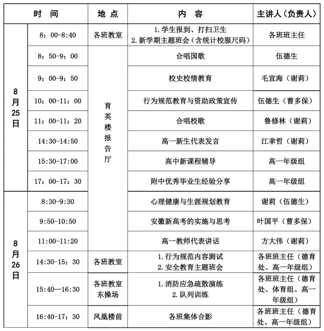 2. 8月25—26日,入学教育。(具体安排见《安徽师范大学附属中学2025级高一新生入学教育安排表》)