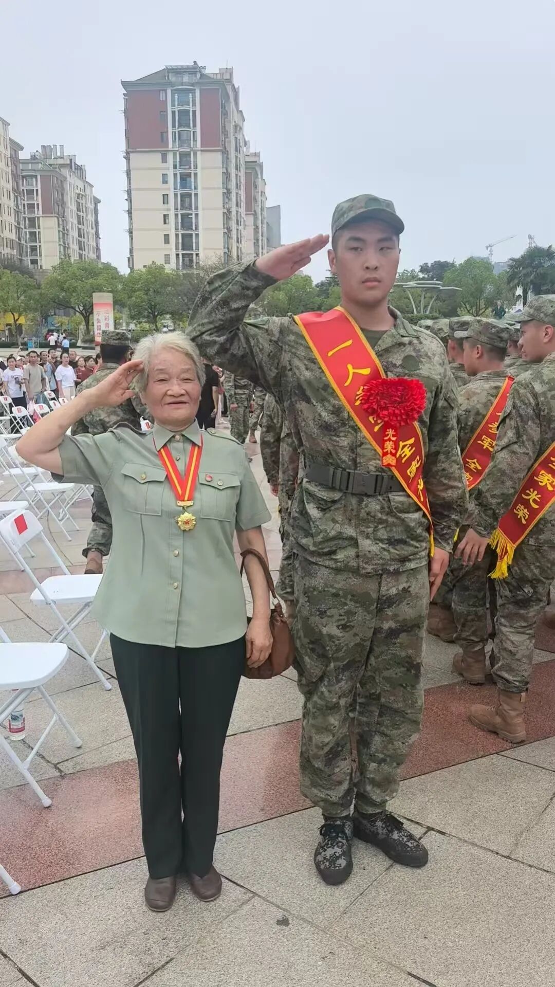 “参军报国是我儿时就有的梦想,今天终于如愿。”21岁的李志伟今年刚刚大学毕业,在出征仪式现场,他激动万分,并与姑奶奶李家英合影留念。
