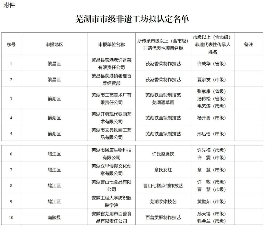 为进一步推动我市传统工艺高质量传承发展,发挥非遗助力乡村全面振兴的积极作用,根据《关于开展省、市级非遗工坊申报认定工作的通知》要求,市文化和旅游局、市人力资源和社会保障局、市农业农村局开展了芜湖市市级非遗工坊申报认定工作。经推荐、复核、评审等程序,现将芜湖市市级非遗工坊拟认定名单予以公示。