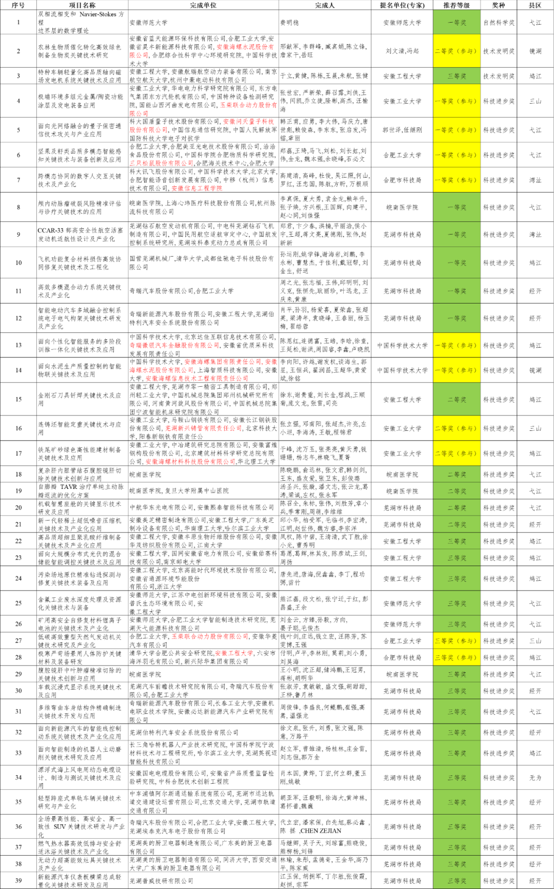 芜湖市入围项目覆盖全面,包括自然科学奖1项、技术发明奖2项和科技进步奖36项,涵盖汽车制造、新能源、医疗健康、新材料等多个领域的关键技术和创新成果。