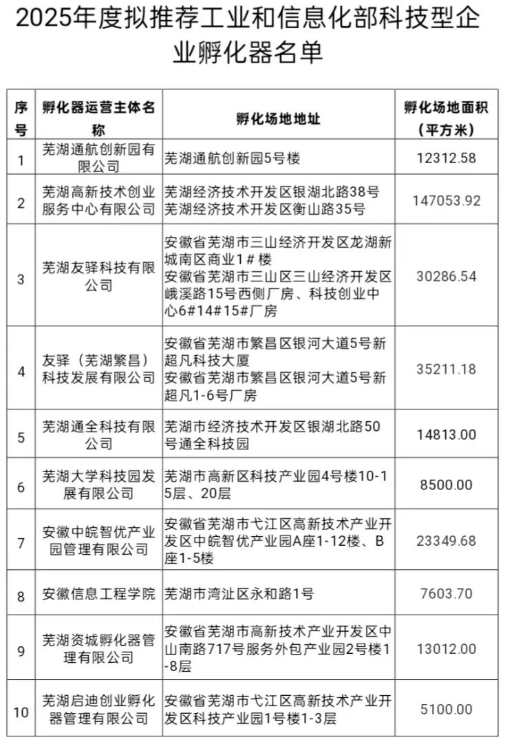 近日,芜湖市科学技术局对2025年度拟推荐申报工业和信息化部科技型企业孵化器的名单进行了公示,共有10家科技型企业孵化器入选(名单附文尾),覆盖芜湖经开区、湾沚区、弋江区、繁昌区等多个区域。
