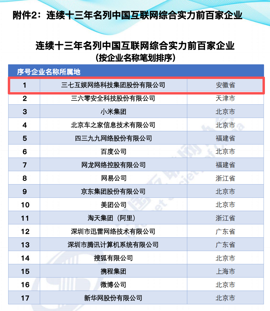 在2025年榜单中,三七互娱凭借企业规模与企业信用、AI创新突破、海外市场拓展成效及社会责任践行等多方面突出表现,排名上升至第17位,相较于2024年的第29位进步明显。此外,三七互娱与小米集团、百度公司、网易公司等17家企业共同入选“连续十三年名列中国互联网综合实力前百家企业”榜单。