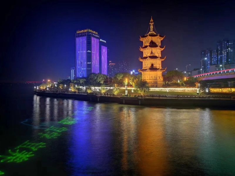 此外,通过裸眼3D激光投影技术打造夜晚临江桥“鱼”和“大米”的形态,生动诠释芜湖“鱼米之乡”的内涵,同时还可以在鱼桥上投影出“一泻千里”的瀑布、“一飞冲天”的飞龙以及“鲤鱼跳龙门”等多种景象。再放眼桥下,激光灯打进江面“幸福芜湖、欢乐芜湖”字体或是“长三角省份地图”图案,令人惊叹!科技感和历史文化并重,半依闹市半偎江,夜色下古老的中江塔通体金色,诉说着芜湖悠久的过往。在老海关,为了突出历史的厚重感,多彩的灯束“收敛”成单一的白色静态光,沧桑感凸显。