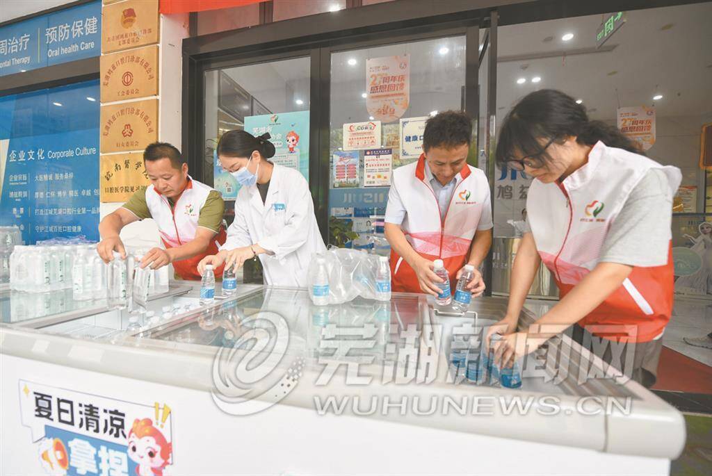 特意将大冰柜摆放在户外,及时添置好方便携带的瓶装水,为巡逻的保安师傅送上冰水并招呼他们到室内纳凉……7月16日一早,位于中央城的鸠兹口腔门诊部温情一幕幕。鸠兹口腔是“爱心冰柜”活动的“老朋友”了。作为芜湖市志愿者协会副会长单位,今年他们不仅开放了两个门诊部的爱心冰柜点,还带头捐赠了1000瓶水用于其他爱心冰柜点的补给。“芜湖市最美志愿者”胡才虎也是如此。在他的发起下,多位志愿者不仅维护好位于龙华社区的爱心冰柜点,也捐水支持其他爱心冰柜点。