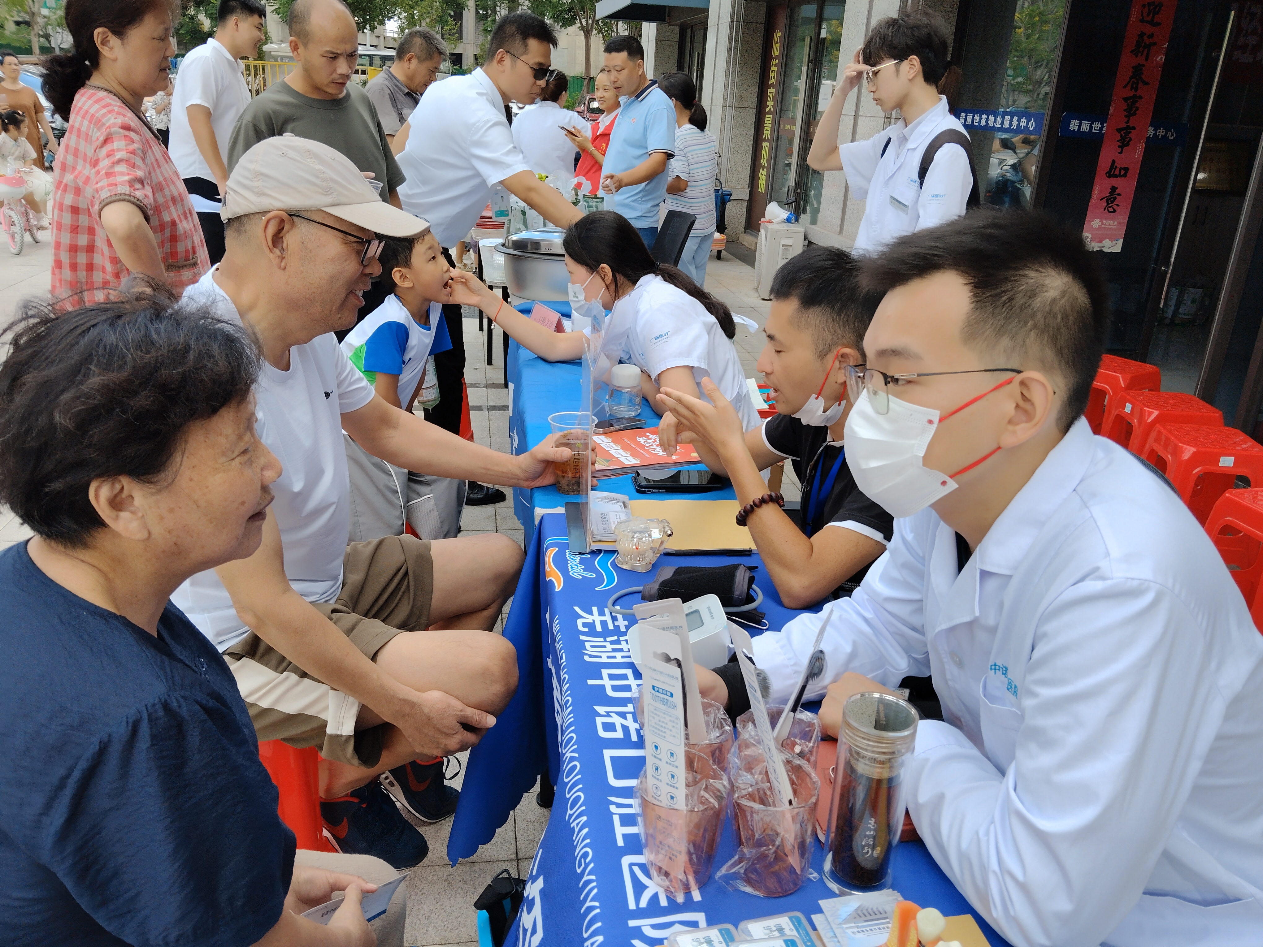 活动现场、人群涌动,热闹非凡。社区为居民们准备了义诊、义剪、美食、便民维修服务以及充满活力的游戏;跳绳、踢毽子等环节。居民自发排成长队一个个乐呵呵的在义诊、义剪和便民维修服务周围等待着。义诊现场,社区请了中诺口腔医生认真地为每位居民们进行口腔检查,为他们分析目前口腔出现的问题和后续保护事项,志愿者在边上辅助其他医护人员为老人测量血压、血糖,并耐心解答各种健康问题,为居民们的健康保驾护航。