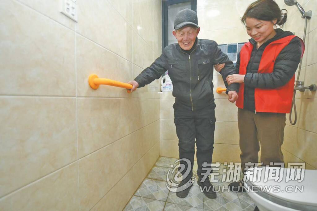 第一户是78岁的独居老人王德松家。老人腿脚不便,曾在湿滑的卫生间摔过几次,自此成了心病,“地砖一沾水就滑,总是担心摔倒后爬不起来”。志愿者莫钢先蹲下身询问老人生活习惯,一遍遍让老人试坐、起身。精准定位后,电钻声响起,两个稳固的扶手很快安装在两侧墙面。
