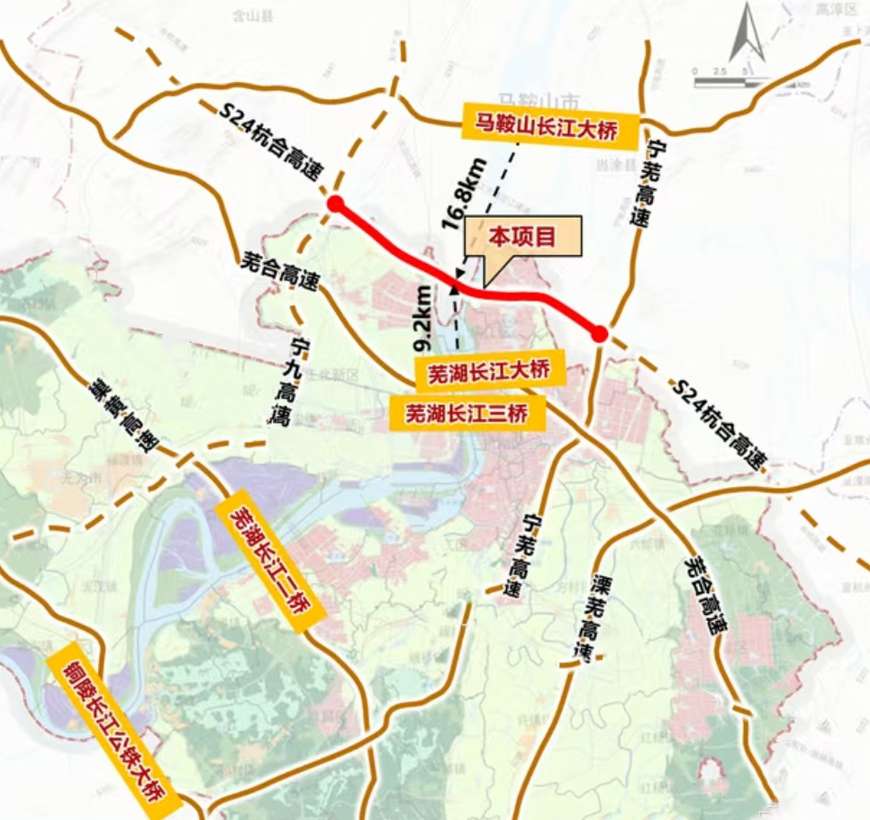 据了解,该项目主体位于芜湖市,起于马鞍山市和县功桥镇,路线自西北向东南前进,跨越牛屯河进入芜湖市鸠江区,与国道347交叉并设置互通;路线从江北沈巷片区北侧穿越至长江北岸,跨越裕溪口水道、陈桥洲、长江主航道至长江南岸,进入芜湖经开区。项目主线长30.88公里,其中跨江大桥段长8.39公里,连接线长14.35公里,全线共设置4处收费站,6处互通。建设期48个月,总投资约155亿元。