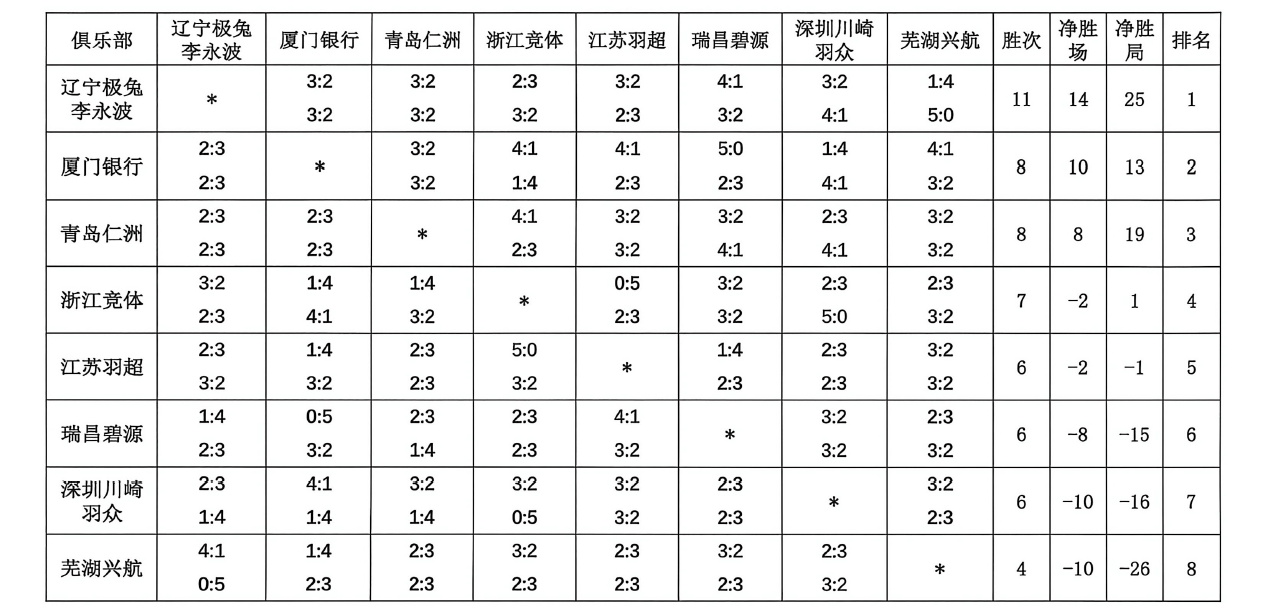 此前,各俱乐部在深圳、杭州、苏州、芜湖四个赛区已完成14轮常规赛比拼,辽宁极兔李永波队、厦门银行队、青岛仁洲队、浙江竞体队排名前四,晋级总决赛。芜湖兴航队排名第八,遭遇降级。