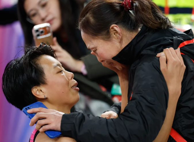 11月19日,广东队选手刘景扬(左)在比赛后和母亲交流。新华社记者 黄伟 摄