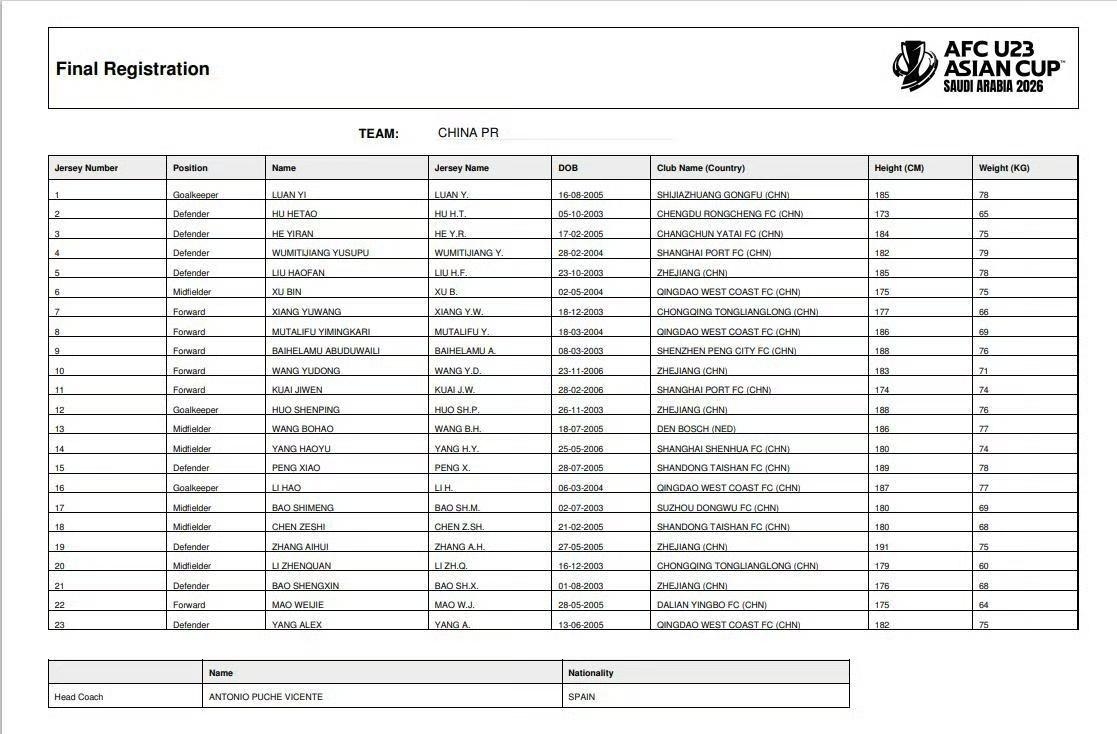 U23亚洲杯中国队23人名单公布