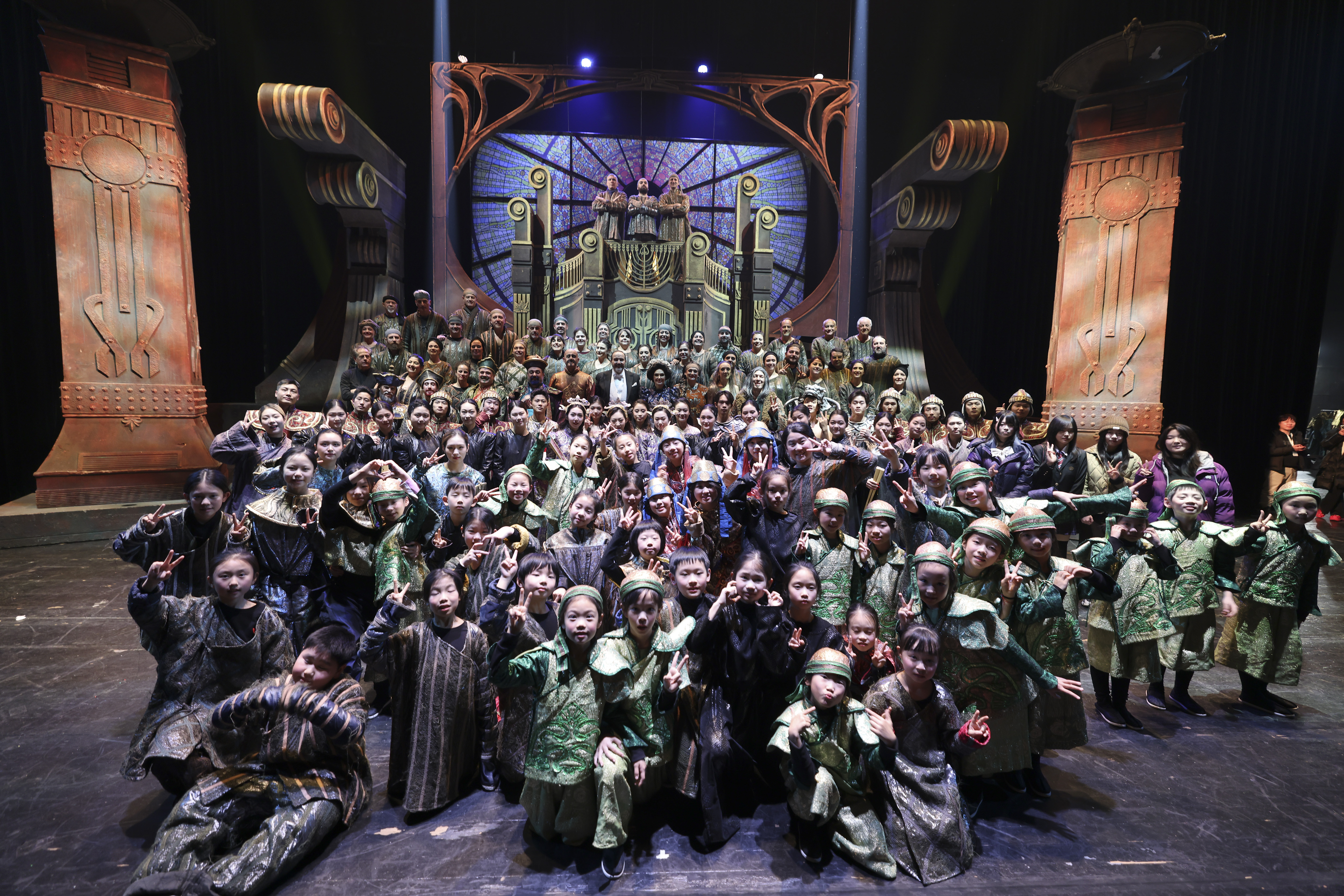 1月10日,在重庆大剧院,歌剧《图兰朵》演出结束后,重庆大剧院童声合唱团和意大利剧团集体合照。新华社发