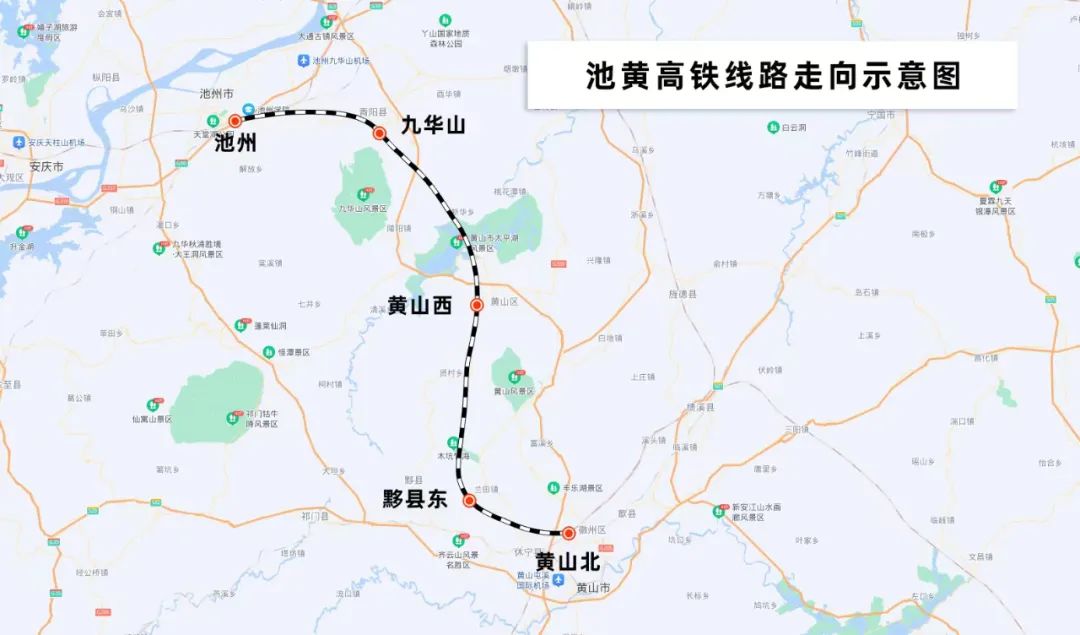 池黄高铁起自池州站,途经池州市贵池区、青阳县,黄山市黄山区,终至黟县东站,正线全长约125公里,设计时速350公里。全线设池州、九华山、黄山西、黟县东4座车站,其中九华山、黄山西为本线新建车站,池州站为既有改建车站,黟县东站为既有车站。