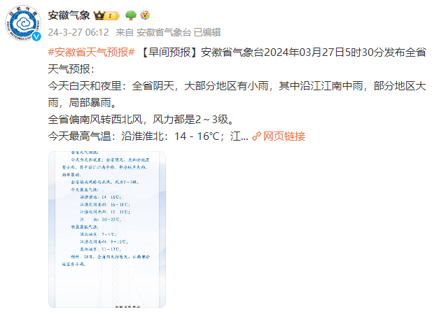 27日(周三):全省阴天,淮河以北部分地区和淮河以南有小雨,其中沿江江南中雨,部分地区大雨。