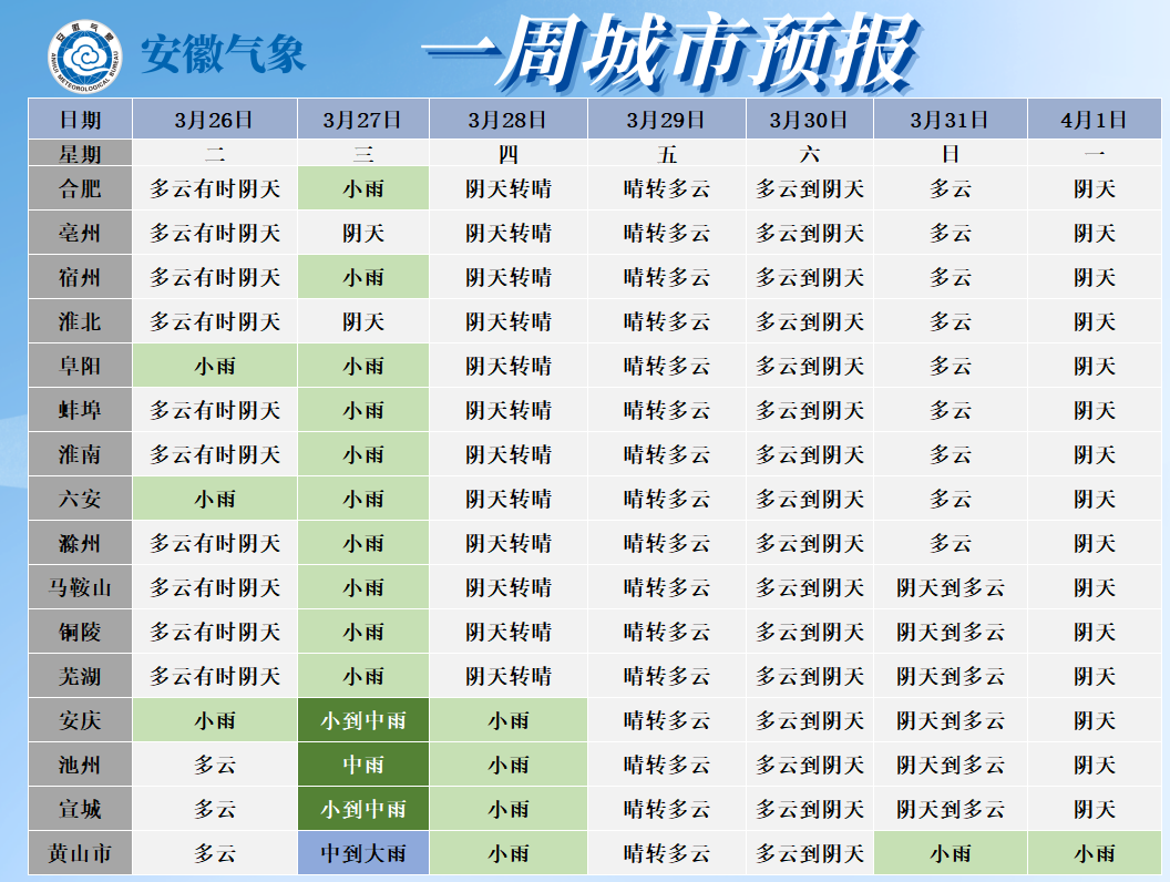 4月1日(周一):全省阴天,大别山区和沿江江南部分地区有小雨。