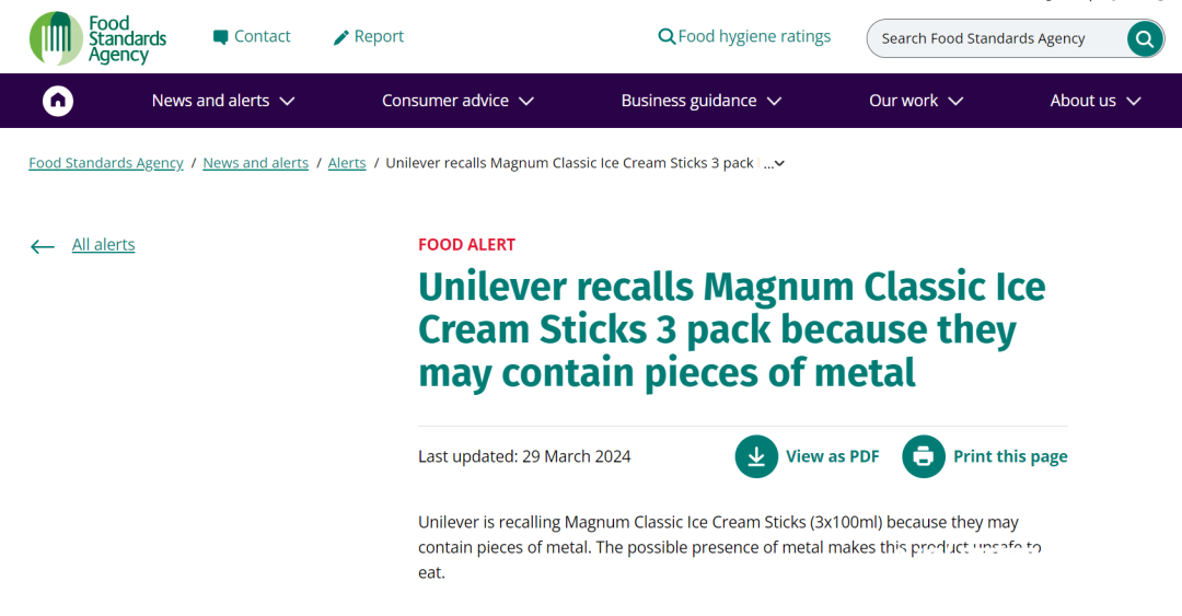 据南方都市报报道,英国食品标准局官网3月29日发布消息称,因为可能含有金属碎片,联合利华(Unilever)正在召回多个生产批次的梦龙经典系列冰淇淋。3月30日,香港食物环境卫生署和澳门特区政府均呼吁市民停止食用相关产品,香港食物环境卫生署称,根据初步调查,香港本地没有相关特定产品批次出售。